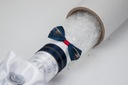 to świeca stylizowana pierścieniem z perełek oraz granatową satyną. Okapnik jak również świeca ozdobiona białymi różyczkami.