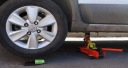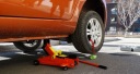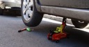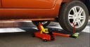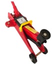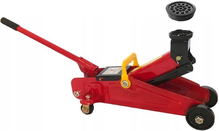 Praktyczny podnośnik samochodowy, wyposażony w koła jezdne, dzięki czemu łatwo się go przemieszcza.
