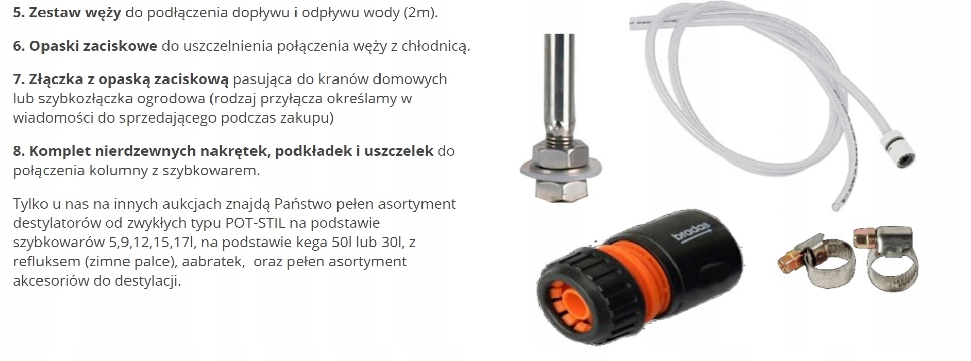 6. Złączka z opaską zaciskową pasująca do kranów domowych lub szybko złączka 1/2'' do wyboru klienta.