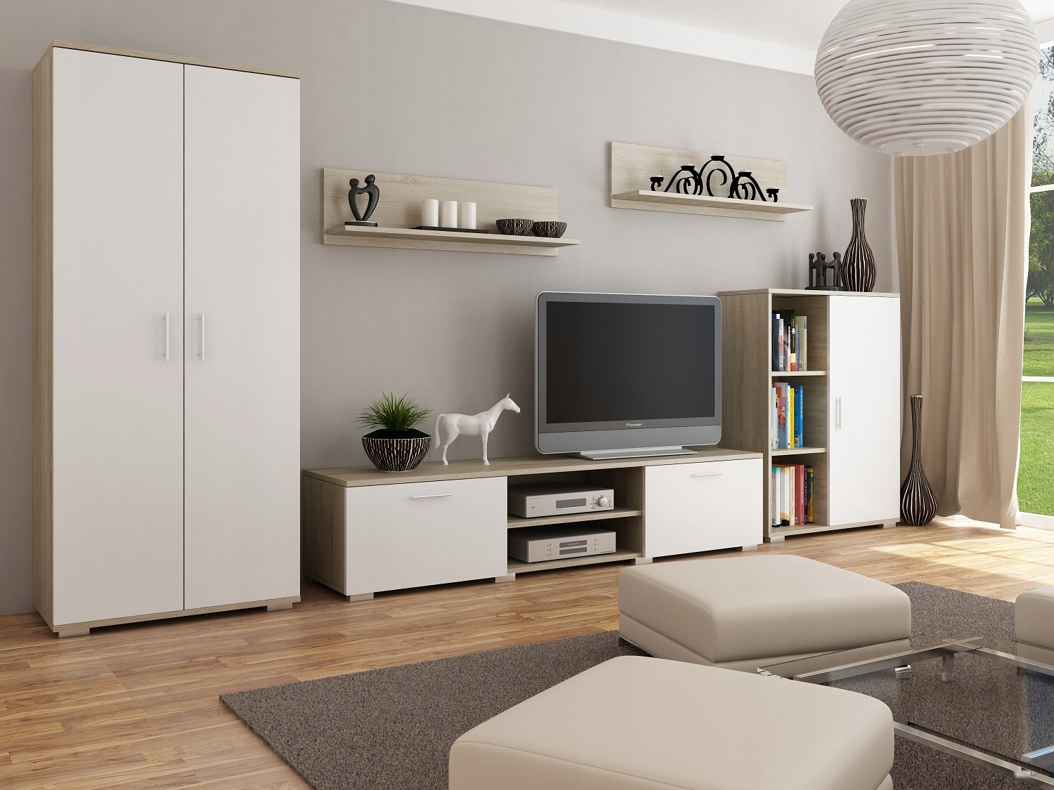 Jak na meblościankę przystało, ten model gwarantuje dużo miejsca do przechowywania. Jest to możliwe dzięki dużej szafie z drążkiem na ubrania oraz niemałej szafce z półkami, a także komodzie do sprzętów RTV. Meblościanka California obejmuje też dwie półki wiszące, które łatwo umieścić w dowolnym miejscu na ścianie. Całość została wykonana z wysokiej jakości płyty laminowanej oraz wytrzymałych akcesoriów meblowych. Dzięki ich zastosowaniu oraz dzięki dbałości o szczegóły, powstały meble o długiej żywotności.