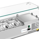 Вместимость-9 контейнеров GN 1/4. Электронный термостат и цифровой дисплей температуры Dixell. Холодильная камера для контейнеров GN с максимальной глубиной 10 см. Приспособление приспособленное к работа в условиях с температурой до 30 ºC.