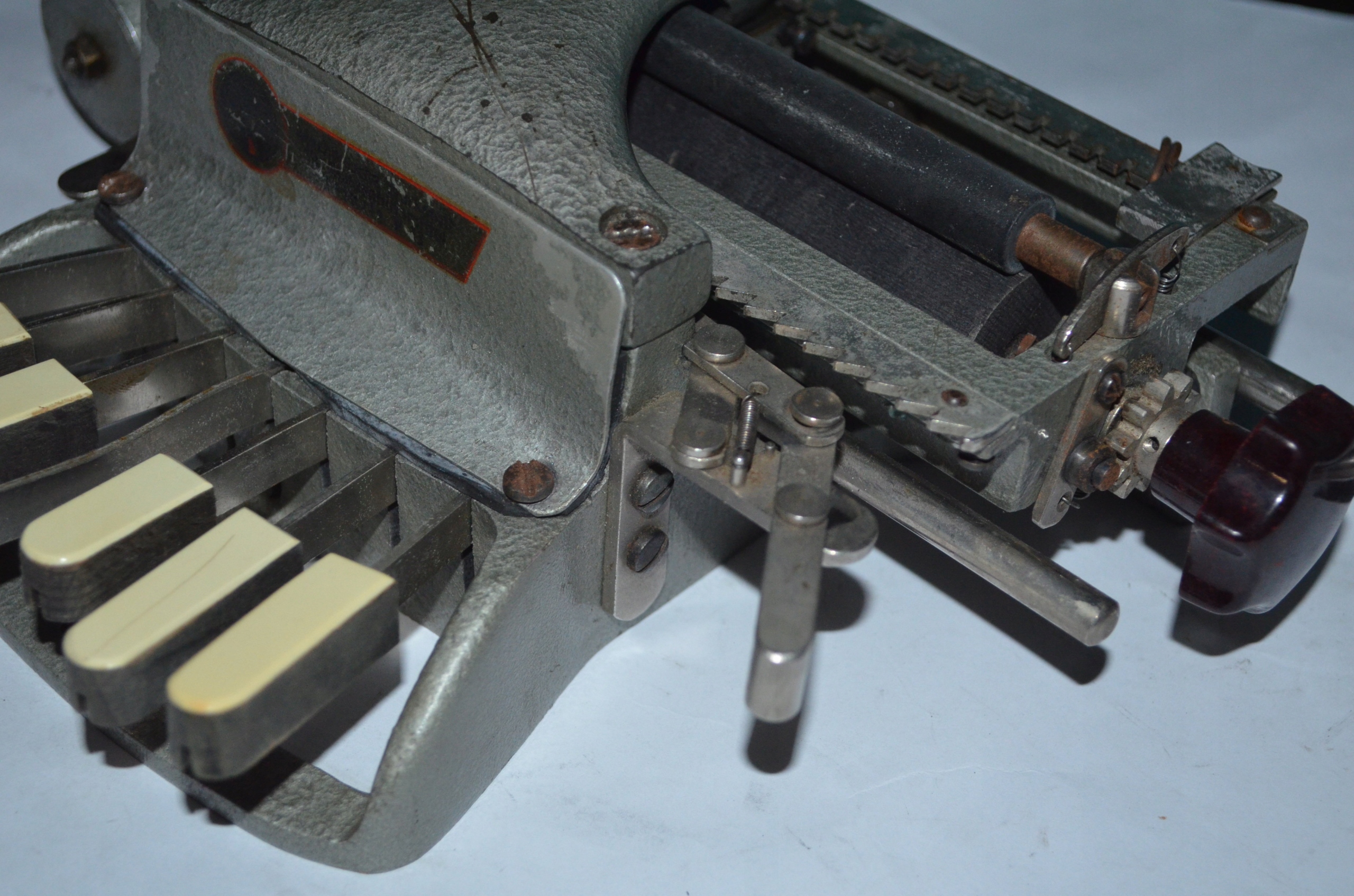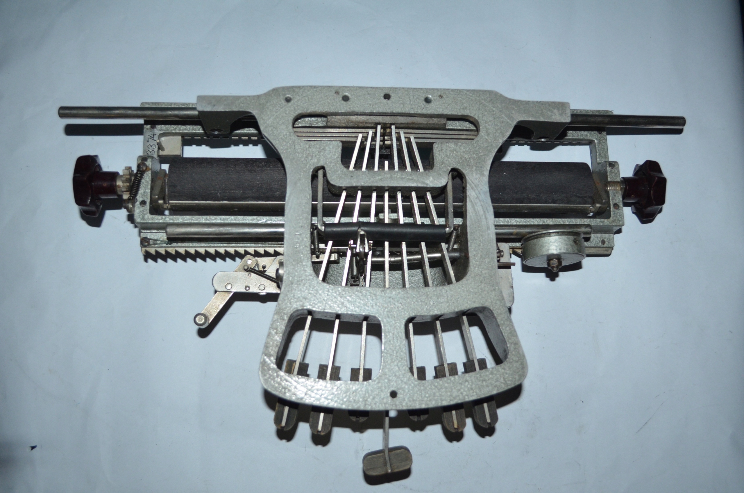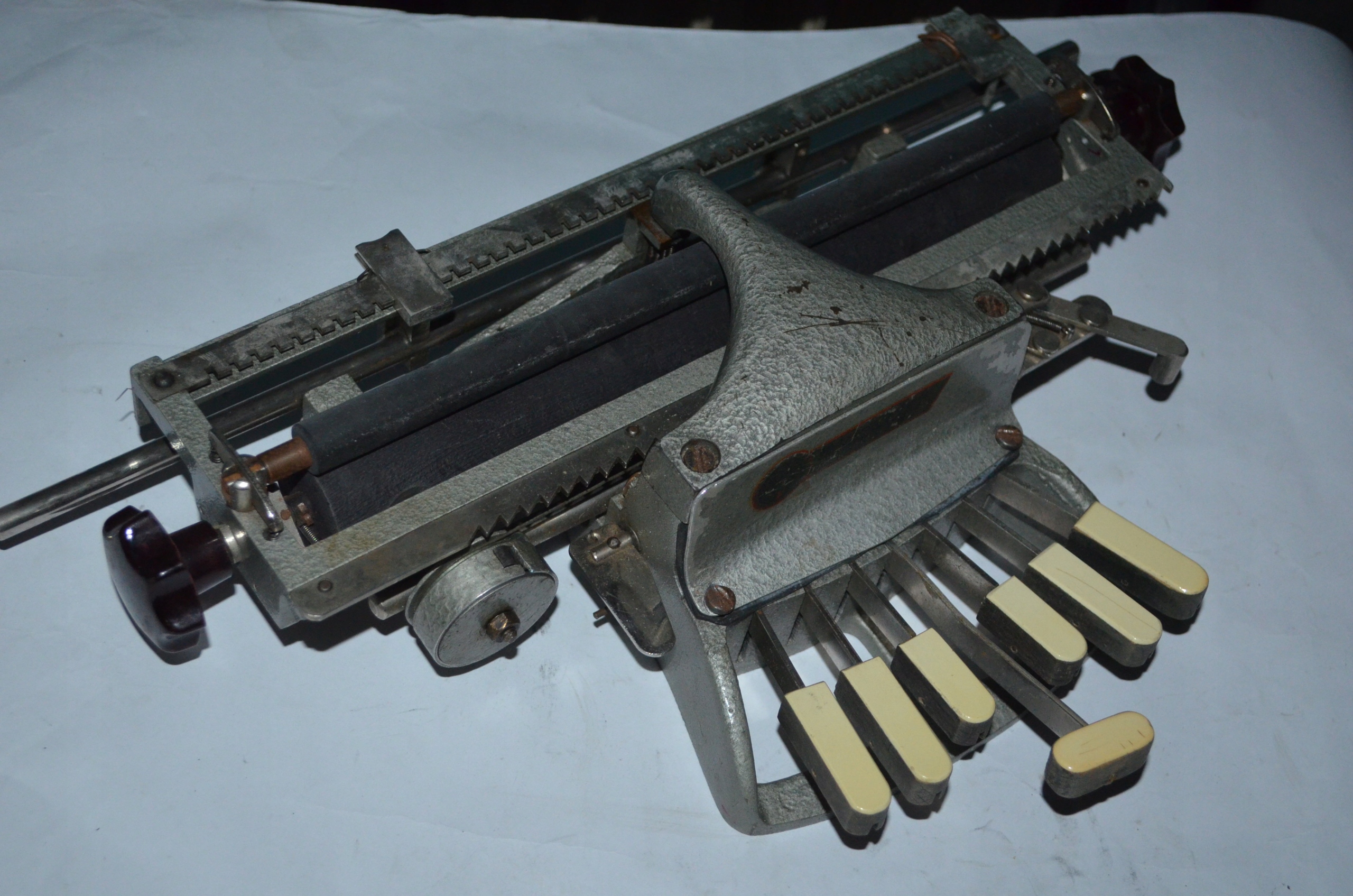 Машина, вероятно, датируется началом двадцатого века. машина имеет необычная аккордовая клавиатура, в которой с помощью комбинаций нажатия различных клавиш в то же время, вы можете получить все буквы алфавита ( в данном случае, написанные алфавитом braille'a). Машина имеет точки-нажимаются одновременно те, которые нужны-седьмой-это интервал. Вероятно, исправный, похоже, механизмы работают правильно.