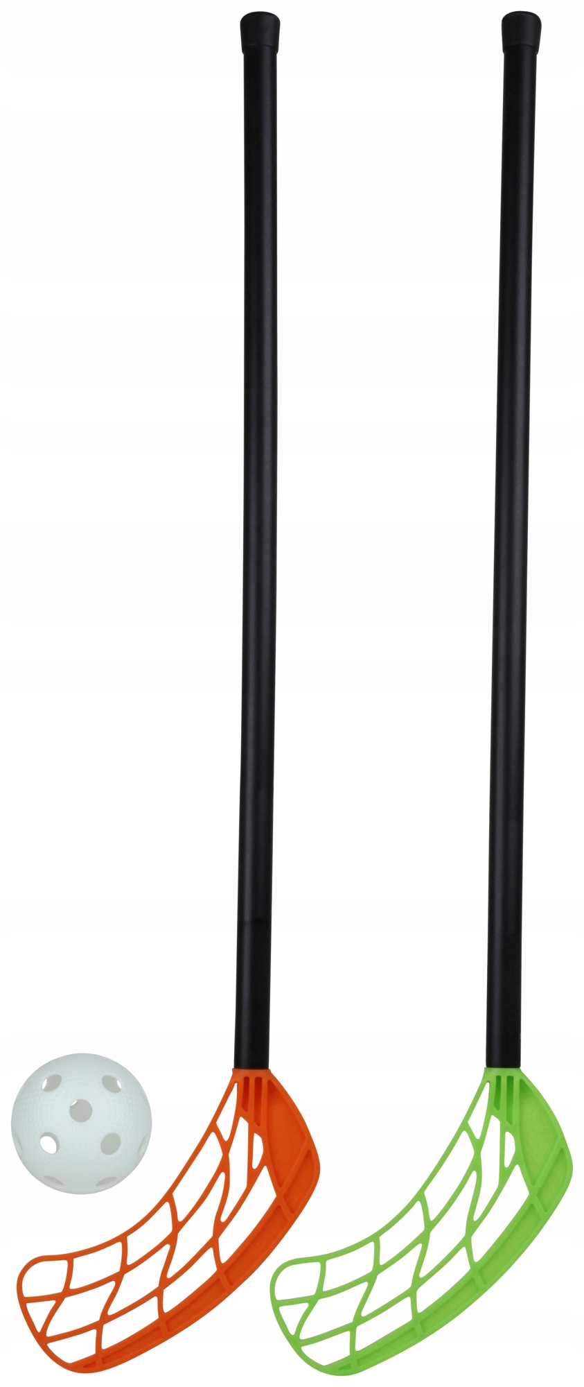 Zestaw do unihokeja dla młodszych graczy z 2 kijami o długości 45 cm) i jedną piłką.