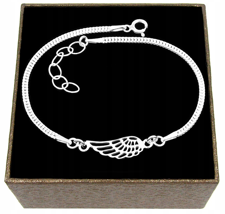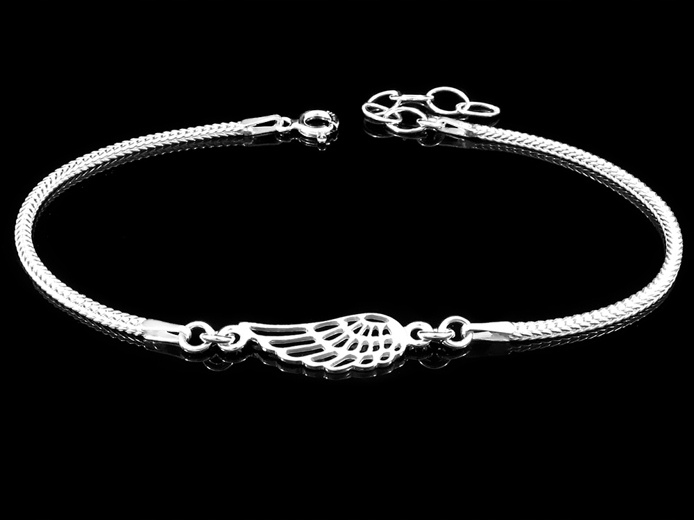 Bransoletka z zawieszką w kształcie skrzydła Anioła na bardzo wygodnym w noszeniu łańcuszku typu lisi ogon.