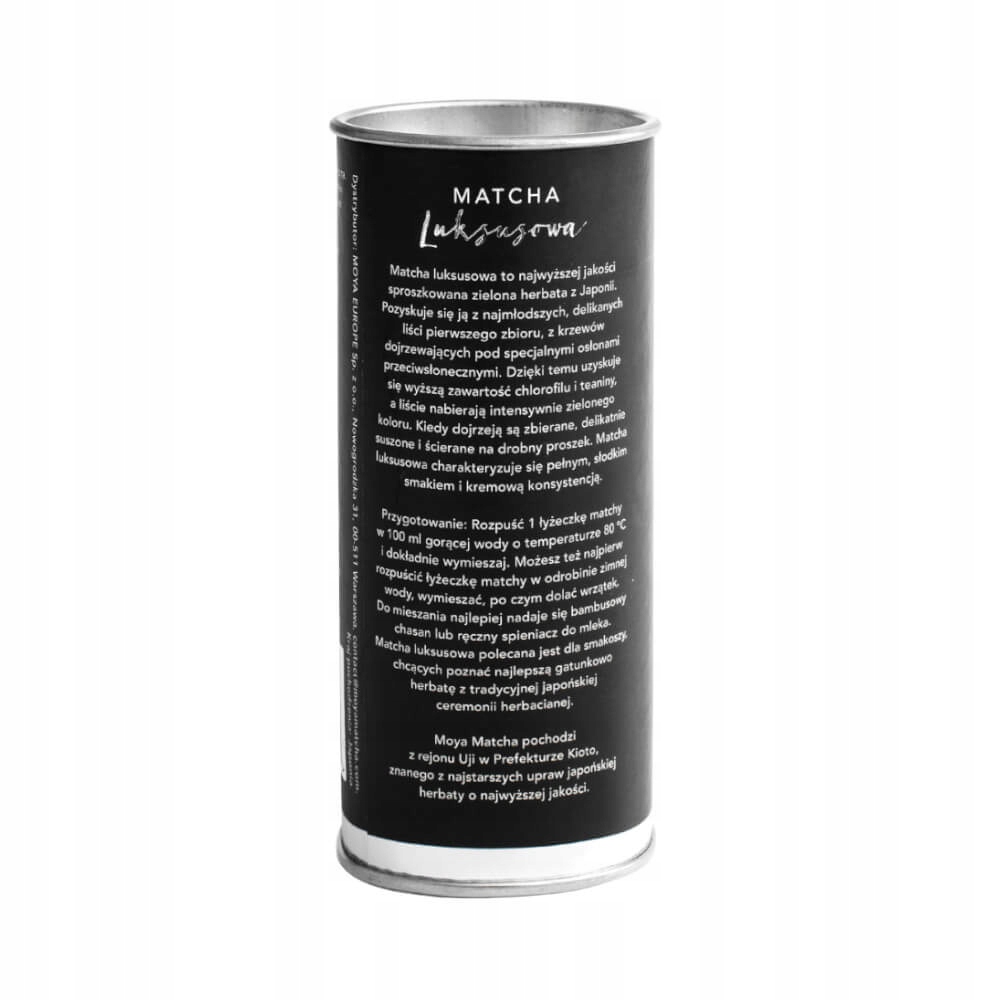 Moya Matcha Luxury-это высококачественный порошкообразный зеленый чай matcha. Имеет для чайной церемонии и приготовления в традиционной форме. Его получают только из первый урожай свежих листьев кустов, которые созревают они защищают их от солнца. Благодаря этому листья получают более высокое содержание хлорофилла и l-теанина и они приобретают чрезвычайно интенсивный зеленый цвет. Только мельчайшие листья зеленого кустарника чай выбирается для приготовления чая Moya Matcha Luxury и сам процесс производства матч чрезвычайно сложен и отнимает много времени.