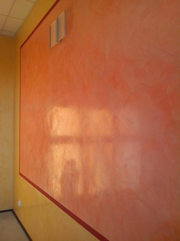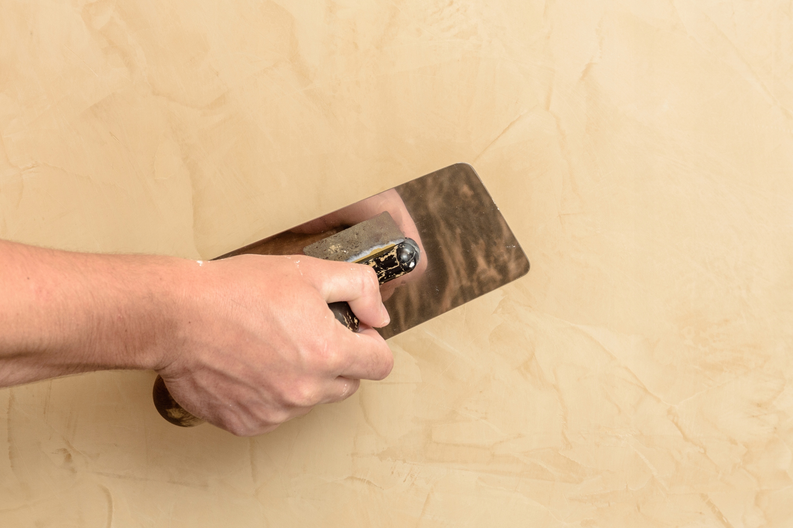 Krok 3 - nakładanie warstwy 1 - Stiuk należy nakładać pacą wenecką ze stali nierdzewnej. Jeśli podłoże nie jest jednolite tzn. nie jest wykonane na gładko gładzą wtedy zaleca się, nałożenie pierwszej warstwy (Stiukiem bazowym), która pozwoli na przykrycie podłoża np.: tynku lub koloru poprzedniej farby, a zarazem pozwala ułożyć wybrany wzór. Odczekać około 1h do wyschnięcia warstwy.