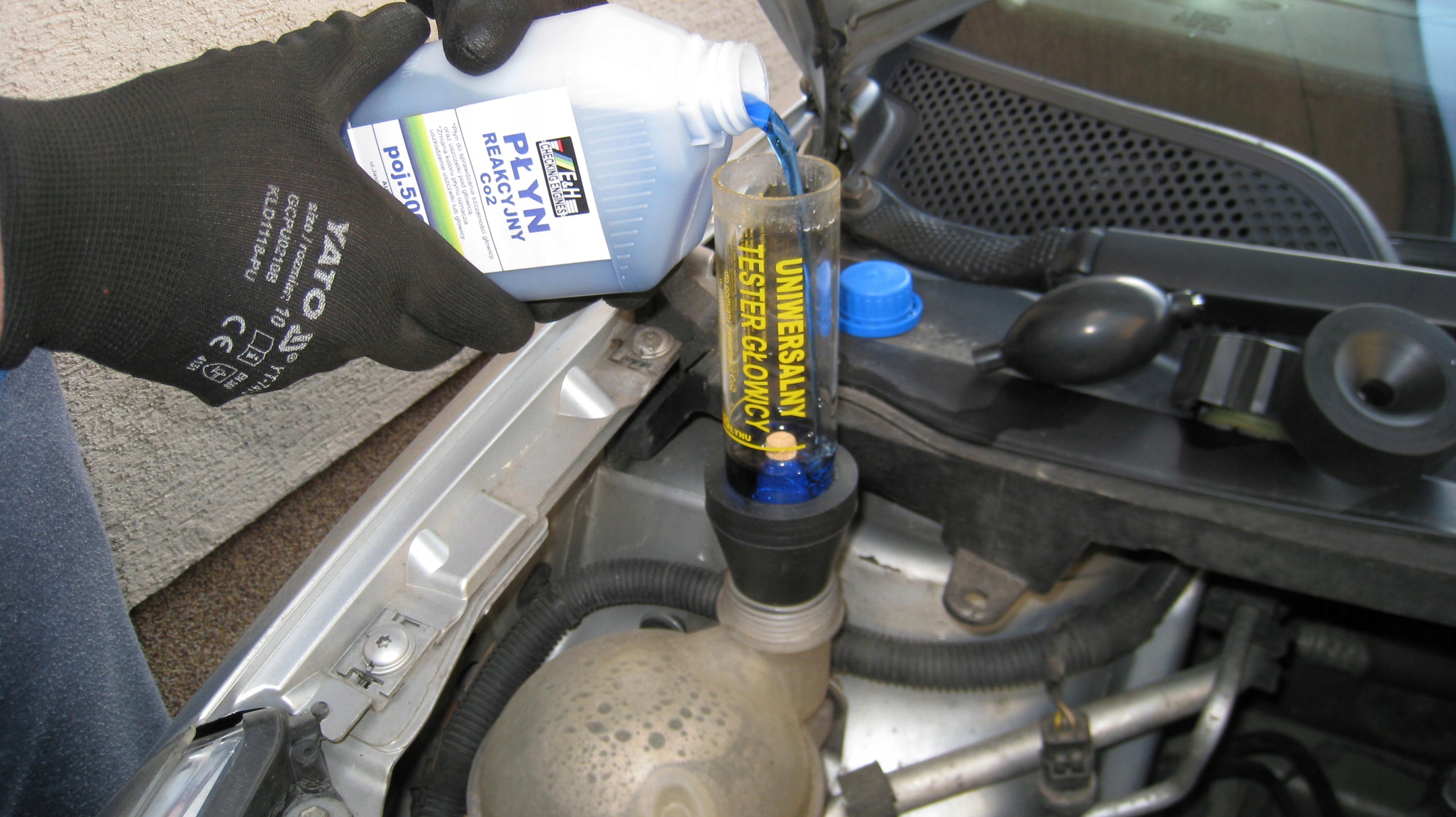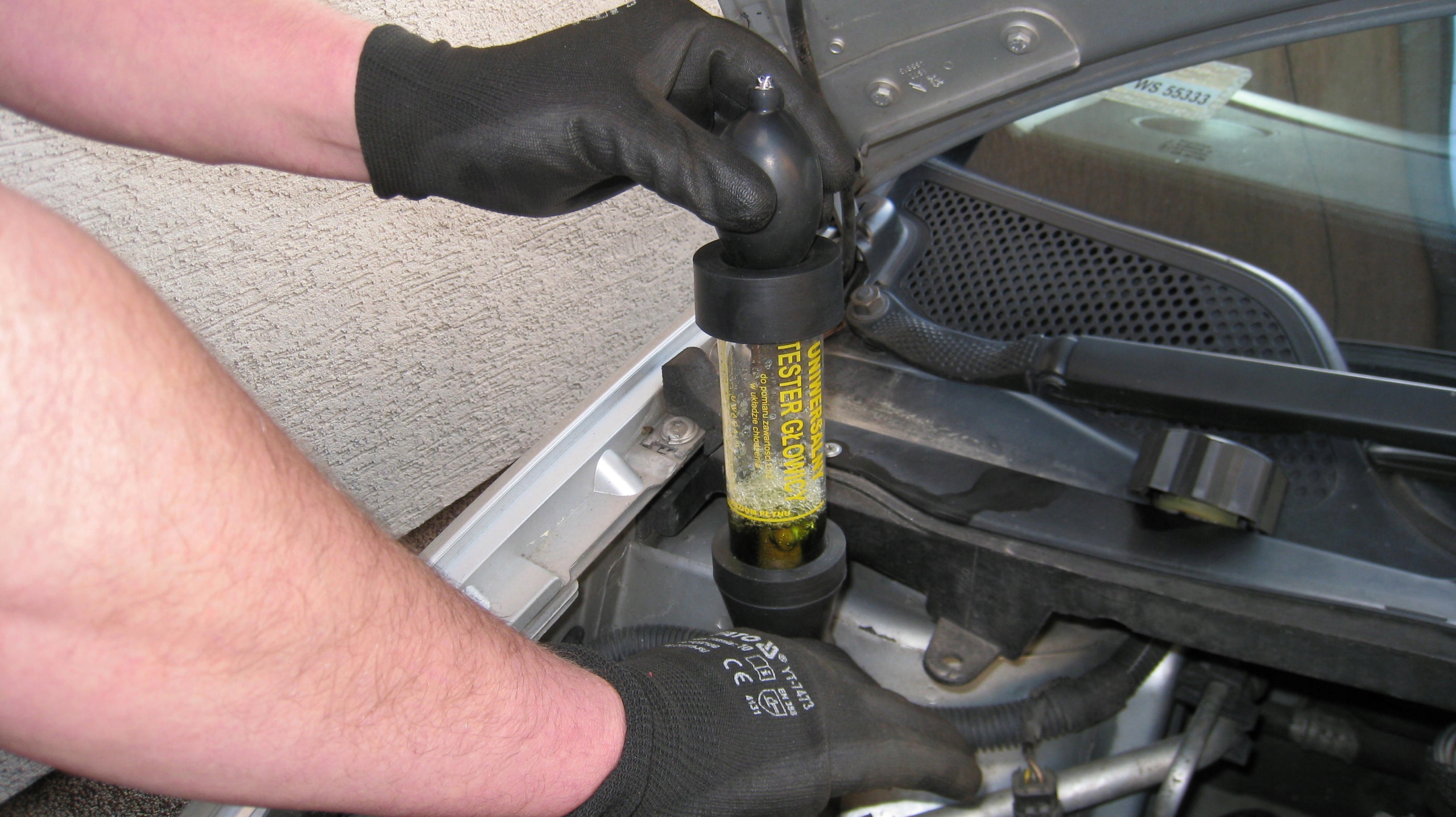 Прибор позволяет легко диагностировать и быстро обнаруживать повреждения прокладки под головкой. В случае повреждения прокладки под головкой или самой головки часть газов выхлопных газов. содержащие m.in. CO2 поступает в систему охлаждения. Принцип работы прибора основан на измеряется содержание CO2 в системе охлаждения. Реакционная жидкость в камере тестера он будет реагировать с газами из системы охлаждения и в случае повышенного содержания CO2 изменится цвет.