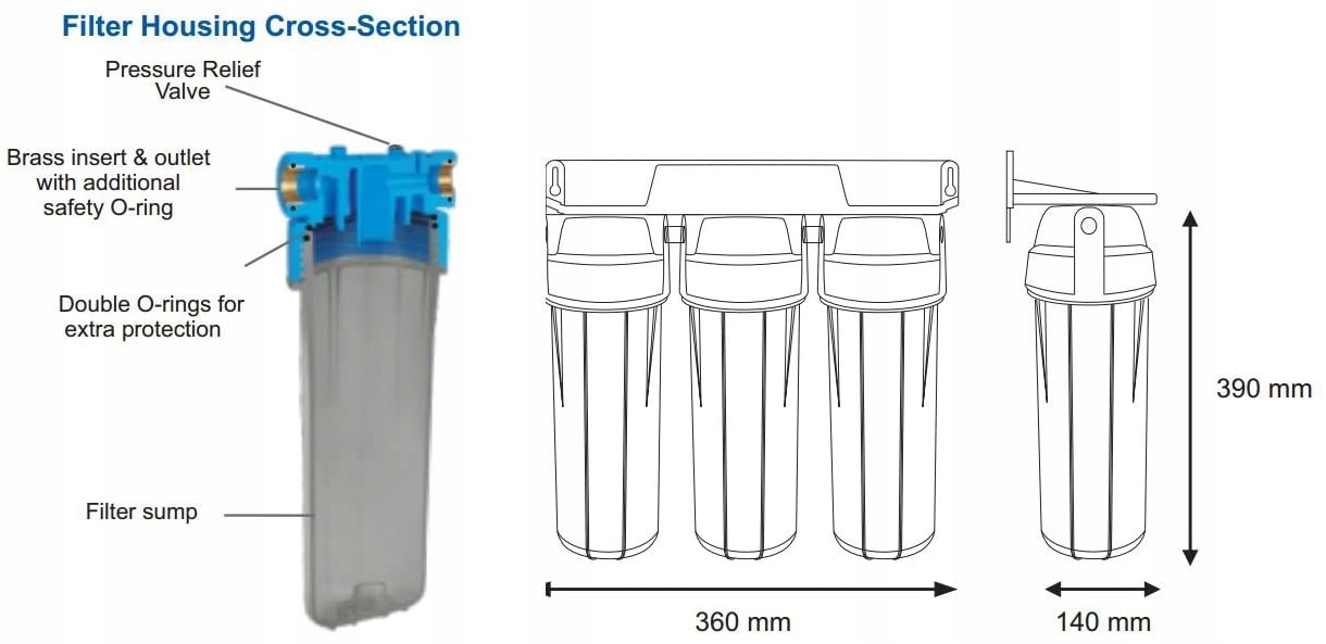 Gotowy potrójny zestaw filtr na rurowy Aquafilter FHPRCL3/4-B-TTRIPLE do szybkiego montażu i ochrony instalacji wodnej przed piaskiem, mułem, szlamem itp zanieczyszczeniami. Filtry na rurowe przeznaczone są do stosowania jako system filtrów w układzie szeregowym. Króćce przyłączeniowe korpusów wyposażone są we wkładkę mosiężną,która zabezpiecza gwint przed pęknięciem.Głowica korpusu wyposażona jest system odpowietrzający filtr,co ułatwia wymianę wkładów filtracyjnych.Klosz w kolorze przezroczystym. Przezroczyste korpusy umożliwiają szybką kontrolę stanu filtra.