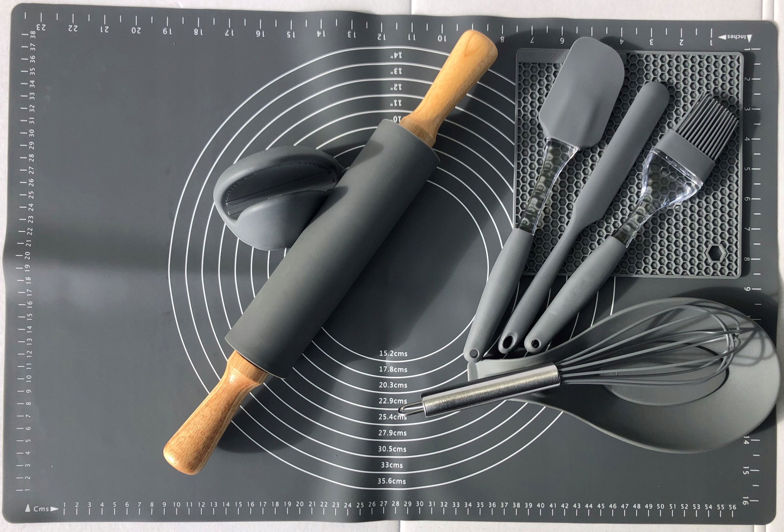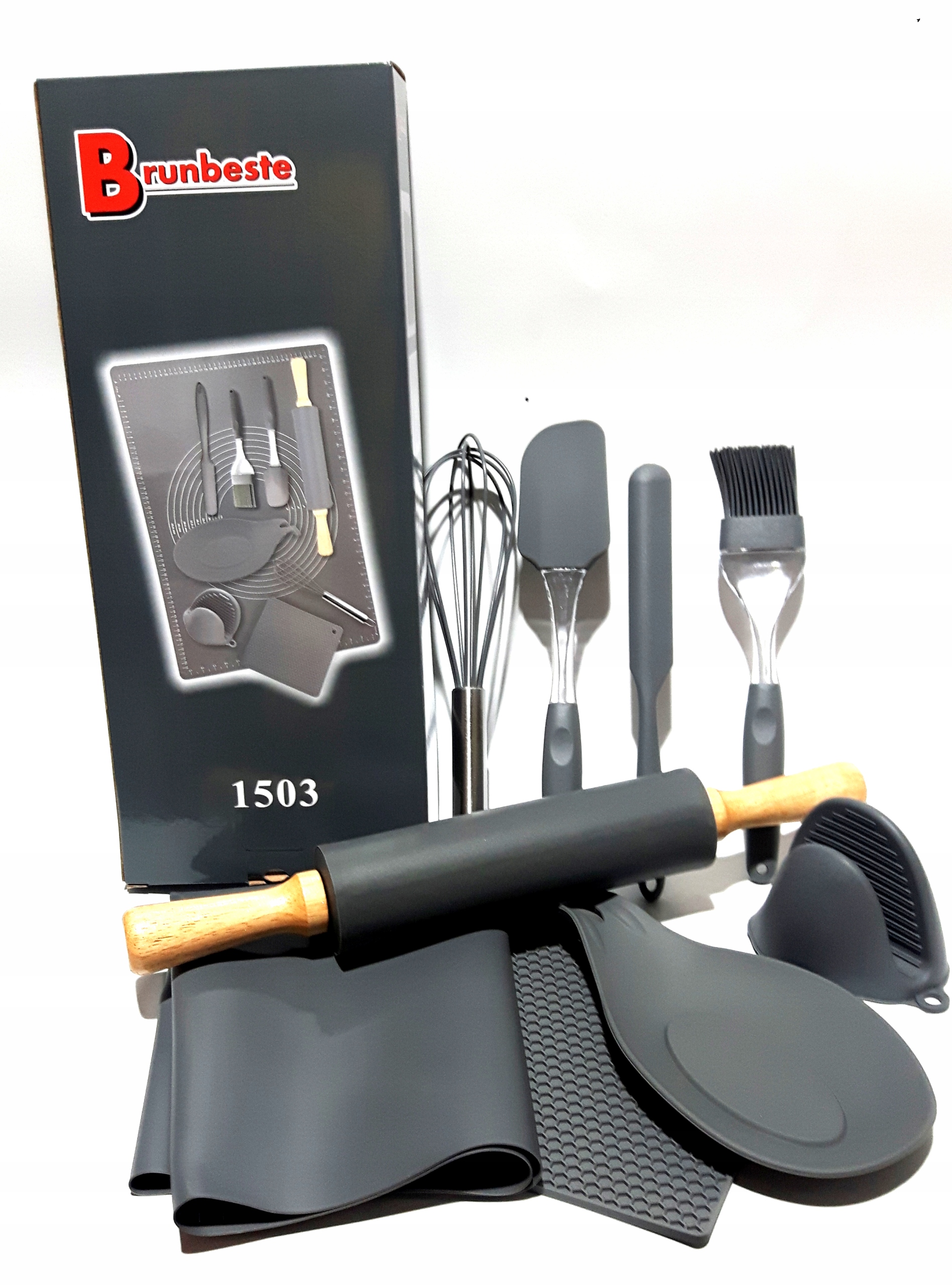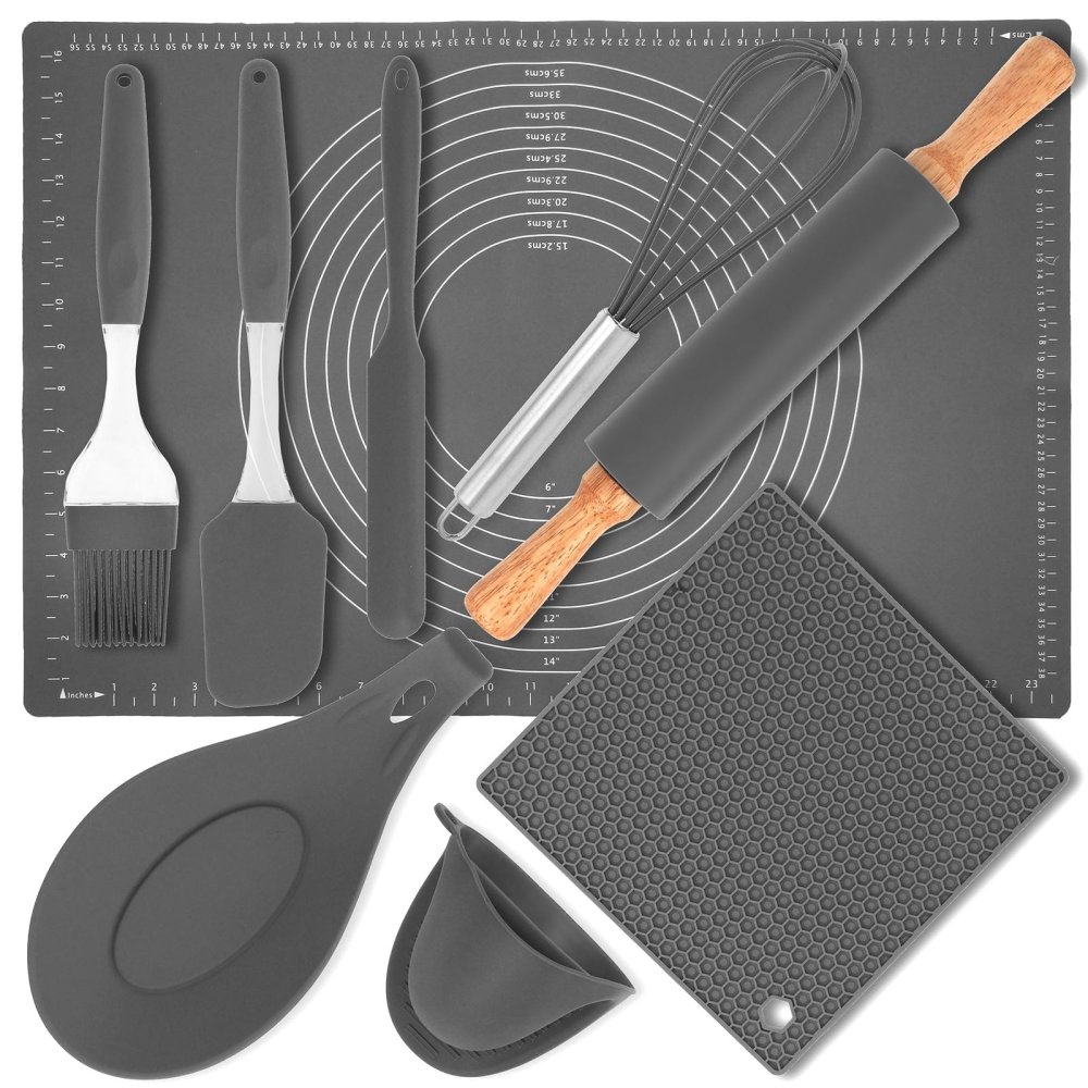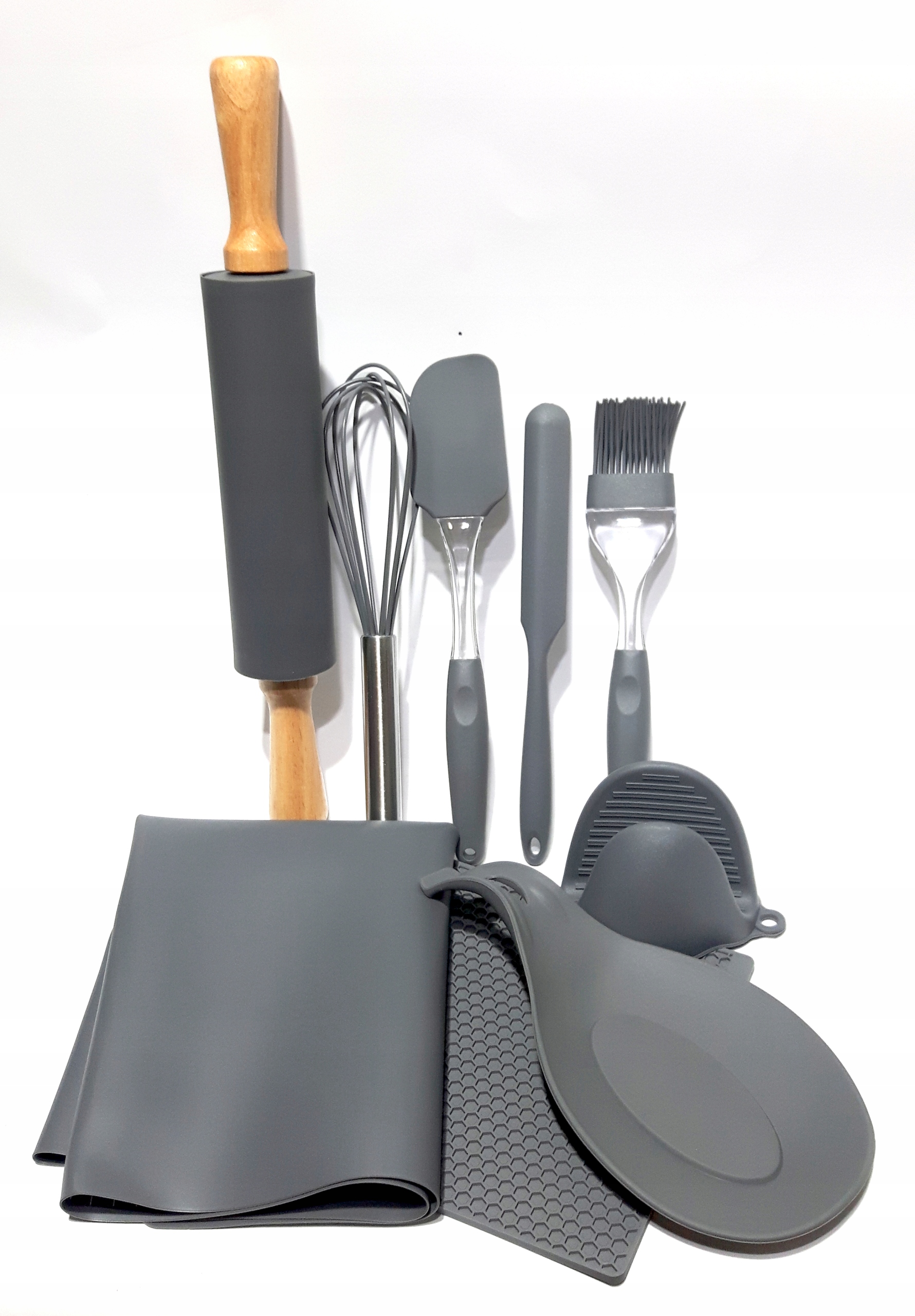 Nowoczesny zestaw akcesoriów kuchennych składający się z 9 elementów.