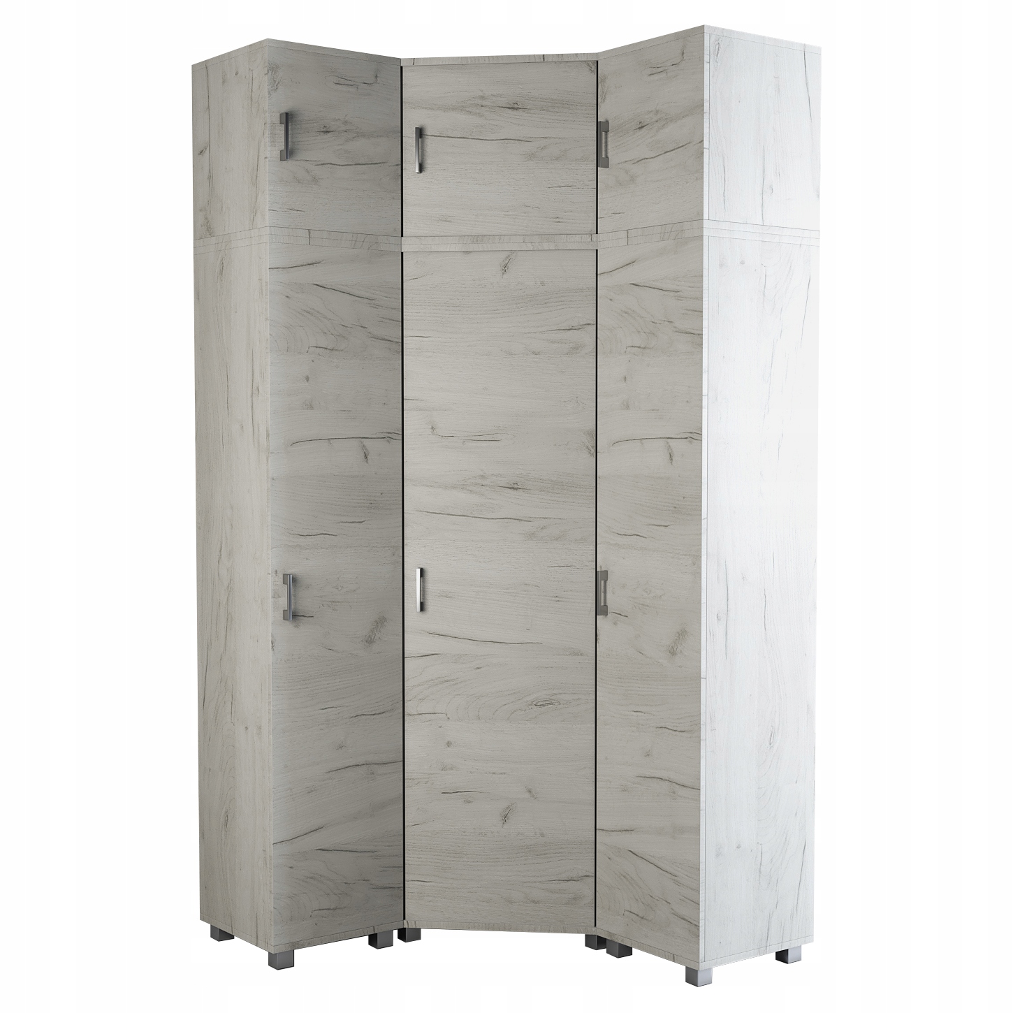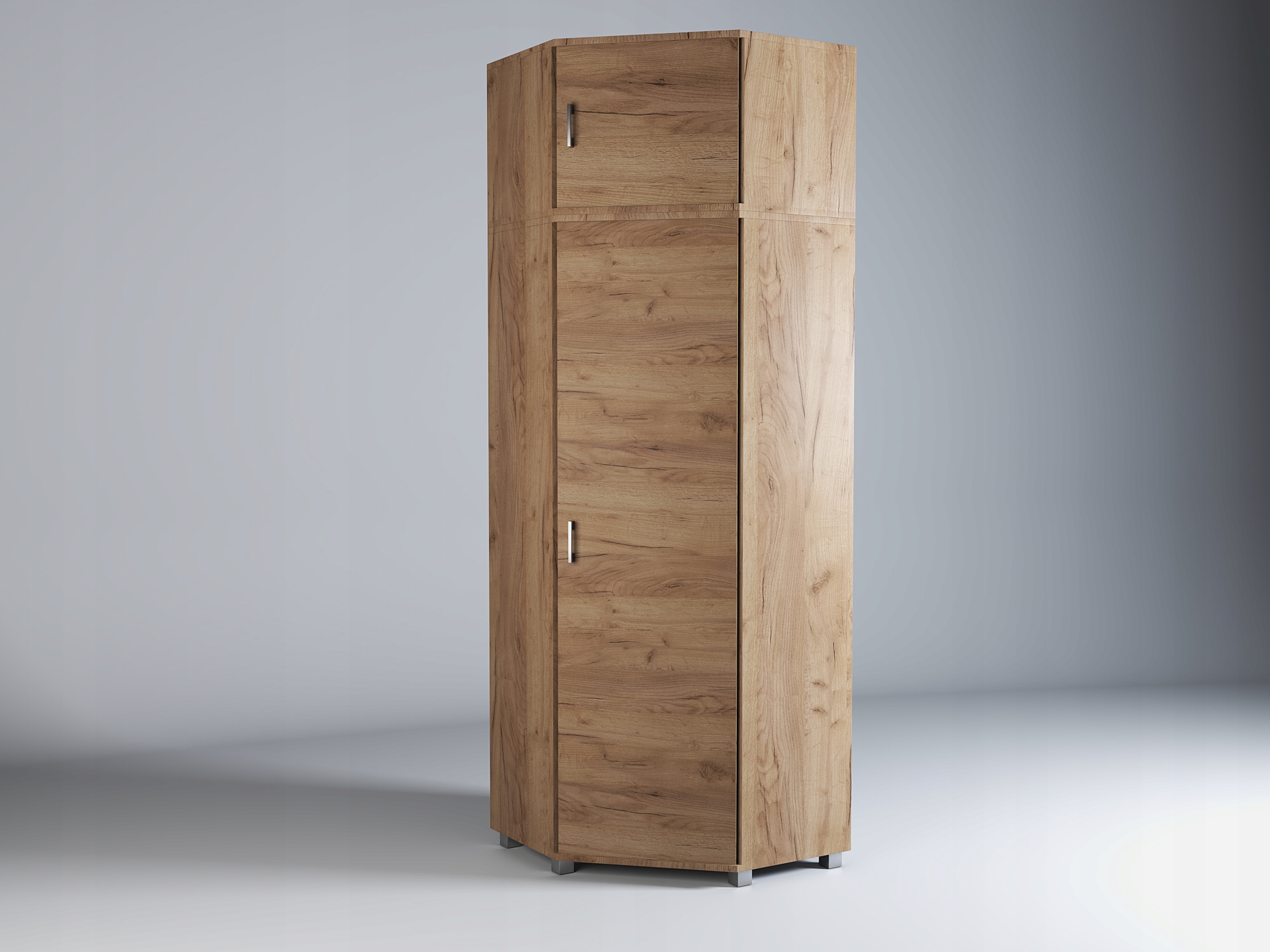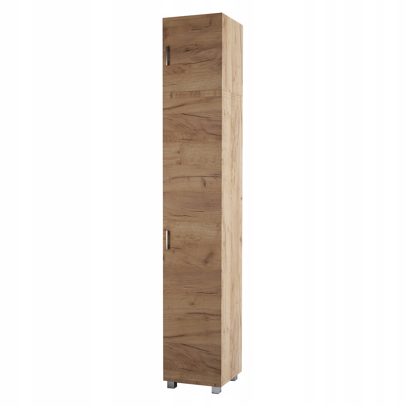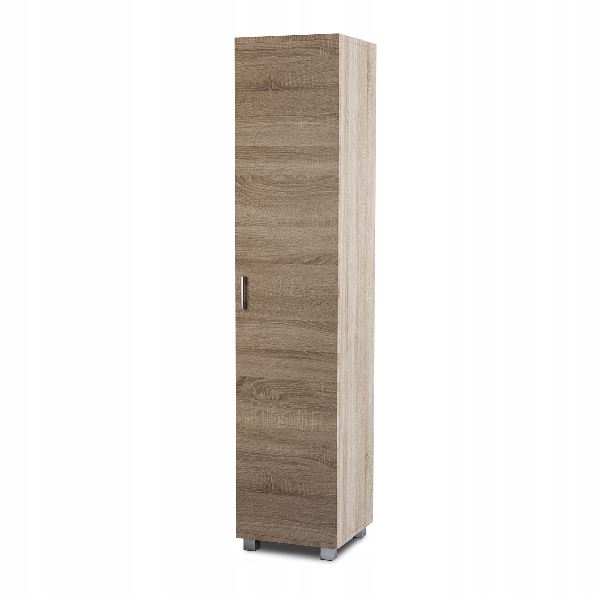 Do produkcji szafy wykorzystano płytę laminowaną 18 mm, obrzeża PCV w kolorze laminatu. Uchwyt oraz nogi dostępne są w kolorze satynowym. Szafa posiada półki i drążek na wieszaki. Uchwyt pionowy po lewej stronie.