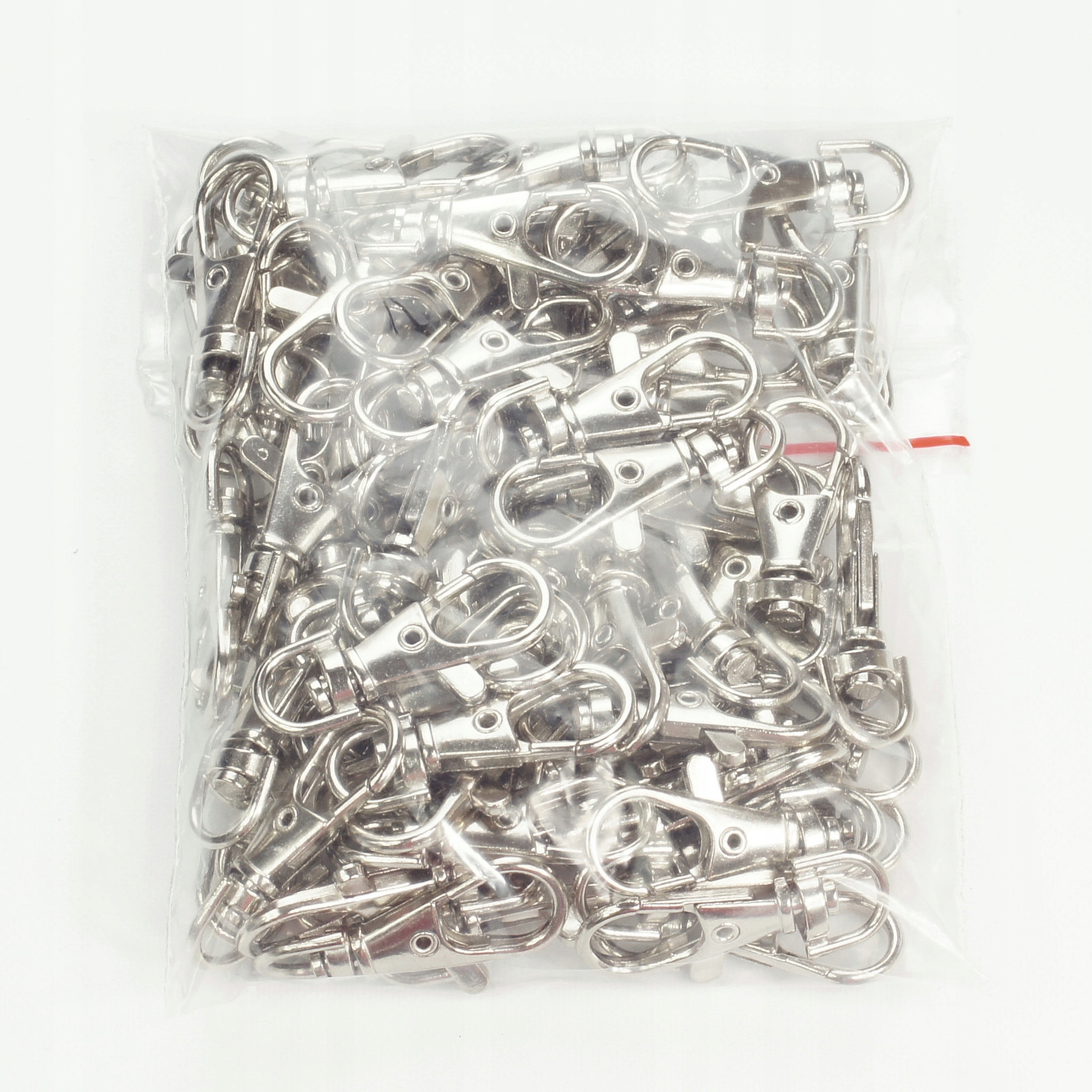 Karabińczyki z dźwigienką oraz wewnętrzną sprężynką, połączone obrotowo z półkółkiem. Zestaw mierzy ok. 38 mm długości. Prześwit oczka to ok. 9 mm. Produkt wykonany z metalu pokrytego niklem w kolorze srebra.