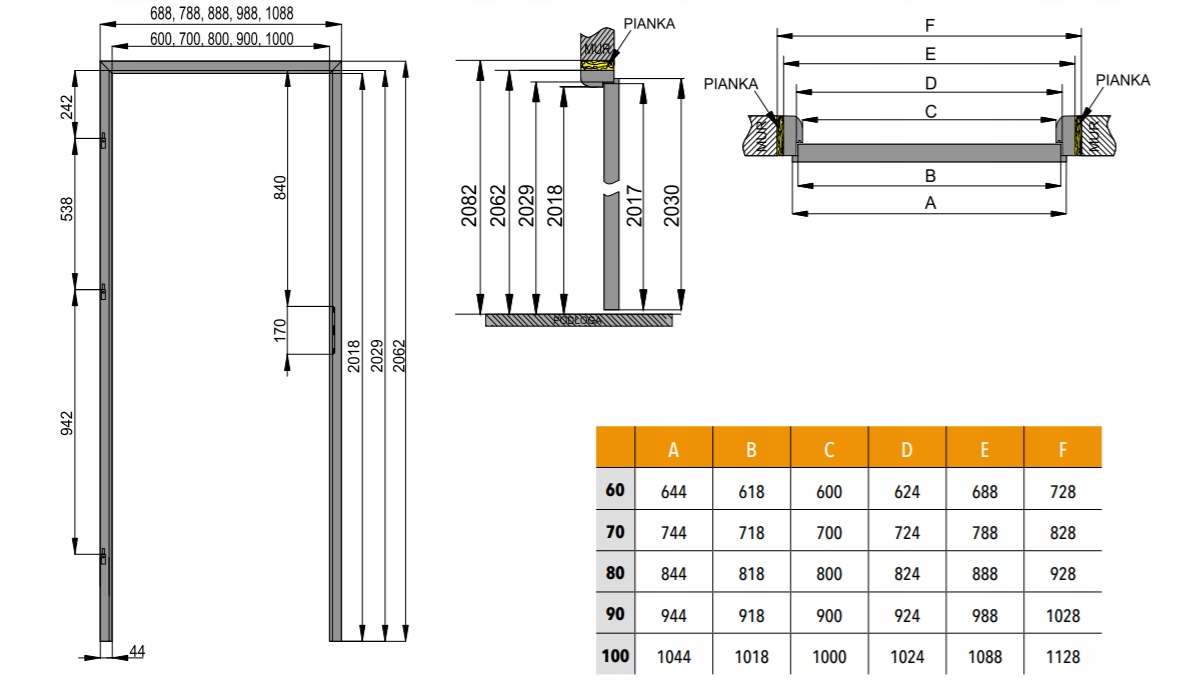 Комплект вертикальных баз правых или левых (соответственно в сторону открытия дверей), наряду с маскировочными элементами, петель, уплотнения дверей, аксессуаров, необходимых для сборки дверной коробки, балки верхней горизонтальной исполнение для ширины дверной створки вместе с маскировочными элементами.