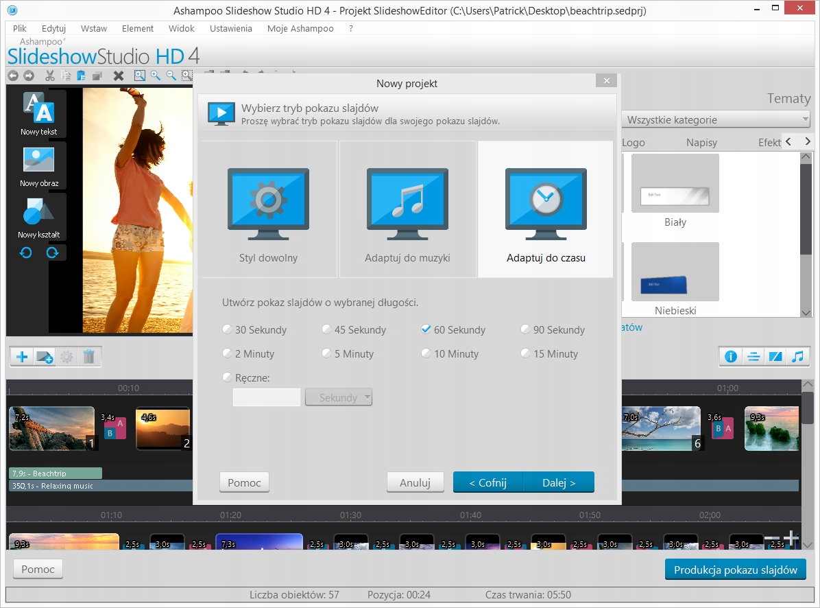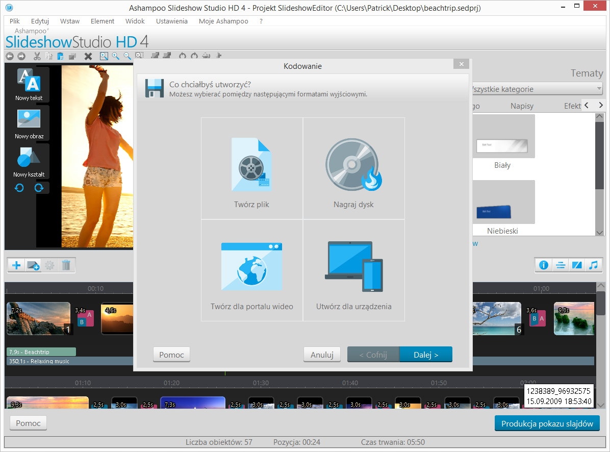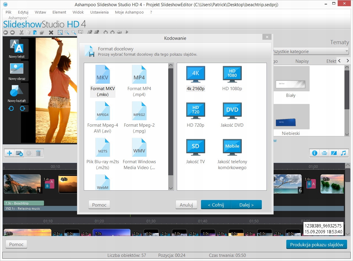 Wysłuchaliśmy i zaimplementowaliśmy wiele z Twoich życzeń w nowym Ashampoo Slideshow Studio HD 4! Chcesz tworzyć slajdy szybciej? Żaden problem. Chcesz tworzyć w 4K i zapisywać pliki MP4 i MKV - lub na wiele urządzeń jednocześnie? Dajemy Ci możliwości! Ponadto dodaliśmy 17 nowych efektów przejść (i wiele więcej kombinacji!), szybsze kodowanie i 56 nowych efektów dźwiękowych!