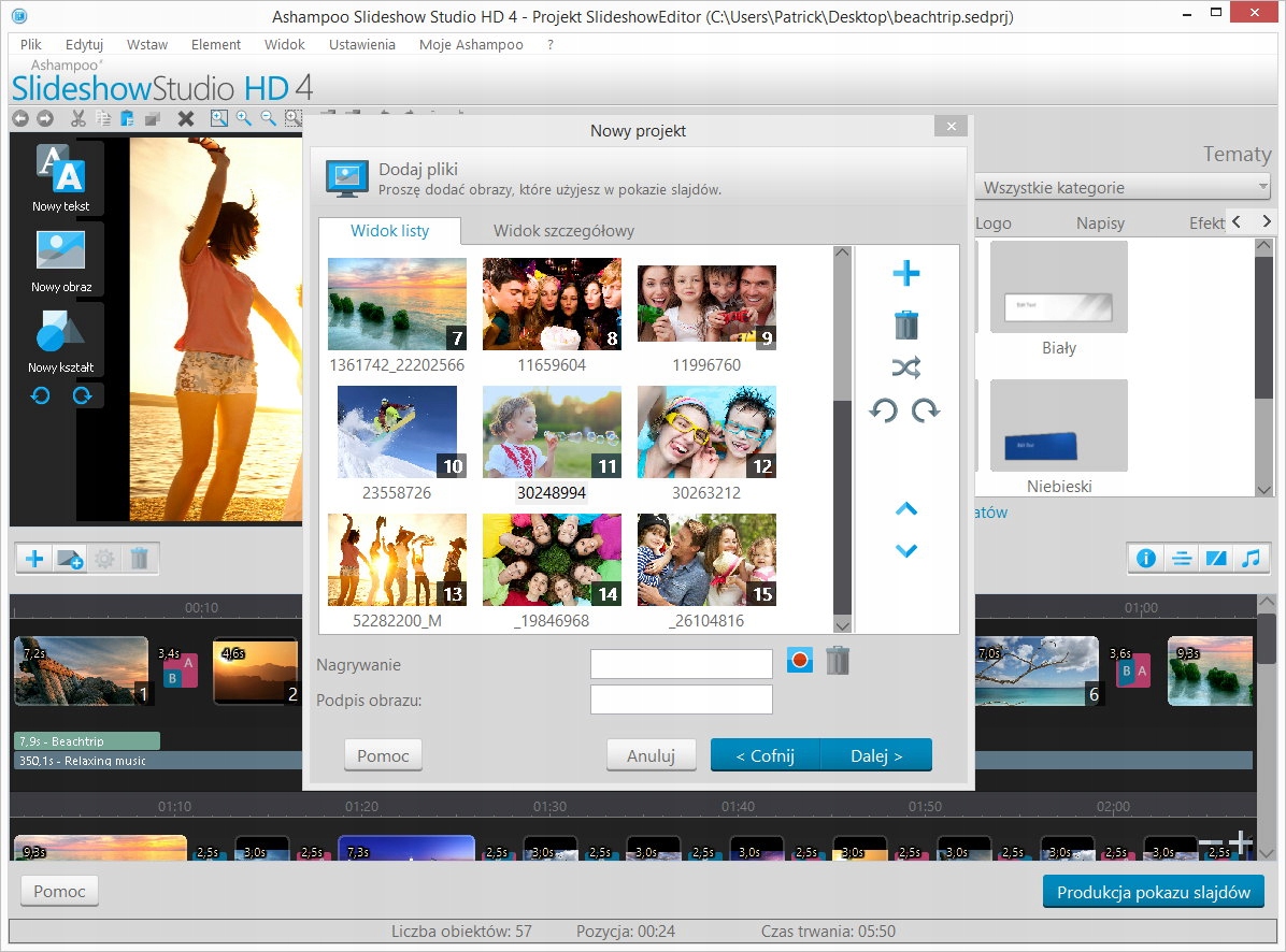 Z łatwością wybierz swoje obrazy i dodaj muzykę, lub samodzielnie zapewnij narrację. Wszystko jest logiczne i proste. Możesz także dodać wiele innych ścieżek audio, podkłady dźwiękowe czy komentarz. Teksty wyświetlające informacje, własne logo czy napisy początkowe i końcowe - wszystko jest dostępne w kilku kliknięciach. Gdy skończysz, nagraj pokaz slajdów na nośnik lub wyeksportuj jako plik wideo, to takie proste!
