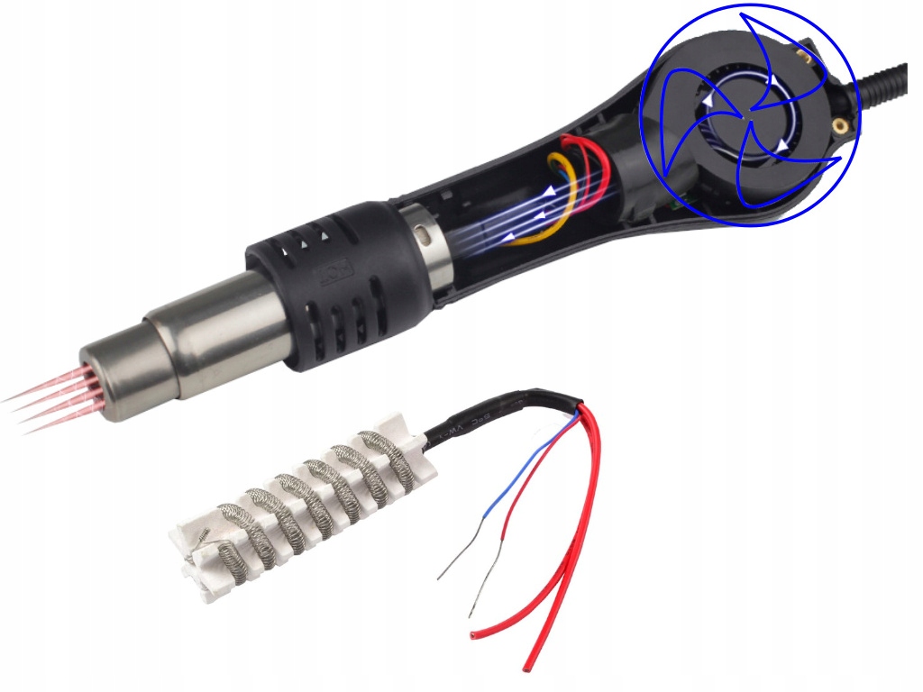 Lutownica hotair jest wyposażona w ceramiczny element grzejny, szybko i równomiernie nagrzewający się. Grzałka jest zbudowana z twardych stopów, umożliwiający długi czas pracy przy wysokich temperaturach, przy tym nie ulegając deformacją, to znacznie zwiększa stabilność pracy i wydłużając żywotność grzałki.