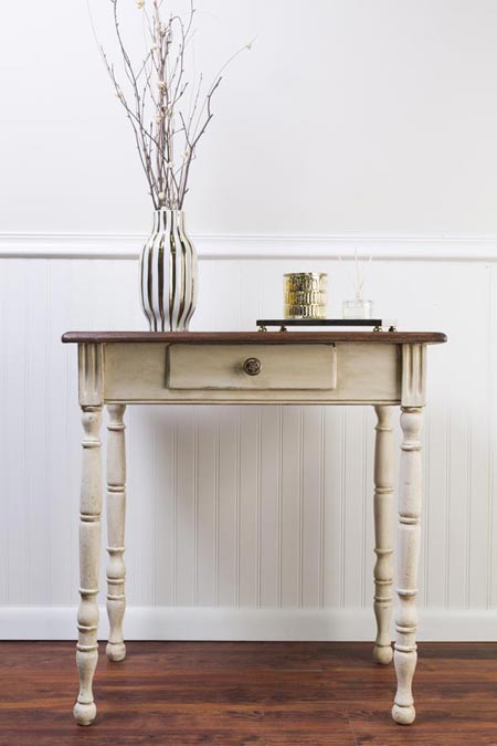 Вы легко придадите античный вид, нанеся два слоя контрастных цветов, затем слегка отшлифуйте поверхность после высыхания краски.