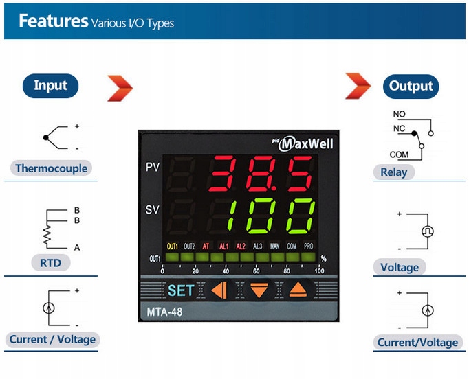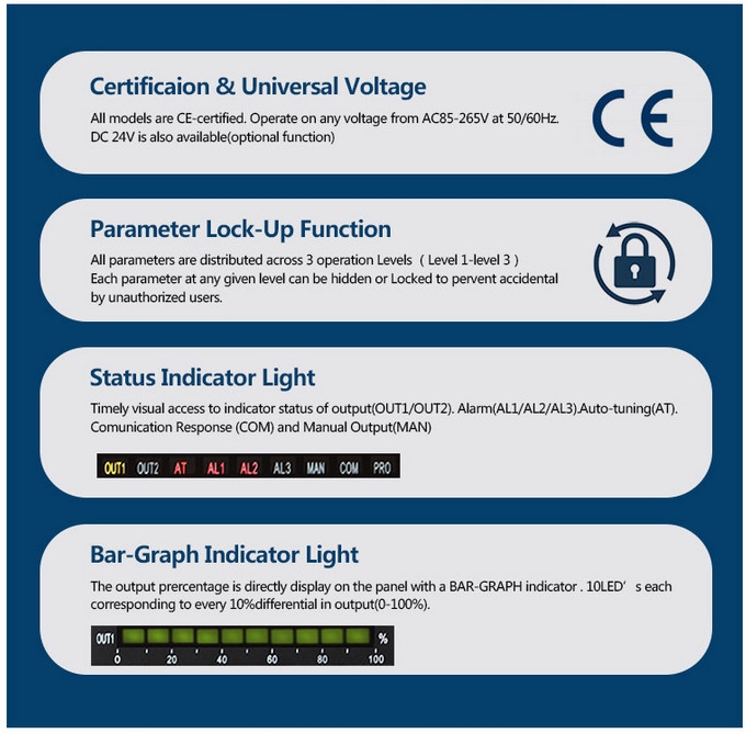Промышленный программируемый ПИД-регулятор Autotune с универсальным входом (M.inn. PT100, термопары типа K, J, R, S, 4-20mA, 0-10V и многие другие) диапазон точности 0,3%, широкий возможности взаимодействия с вышестоящими системами, стандартная глубина установки (80 мм), версия с электропитание 230VAC. Выход типа 4-20мА и дополнительный один релейный выход сигнализации. Основные характеристики устройства: