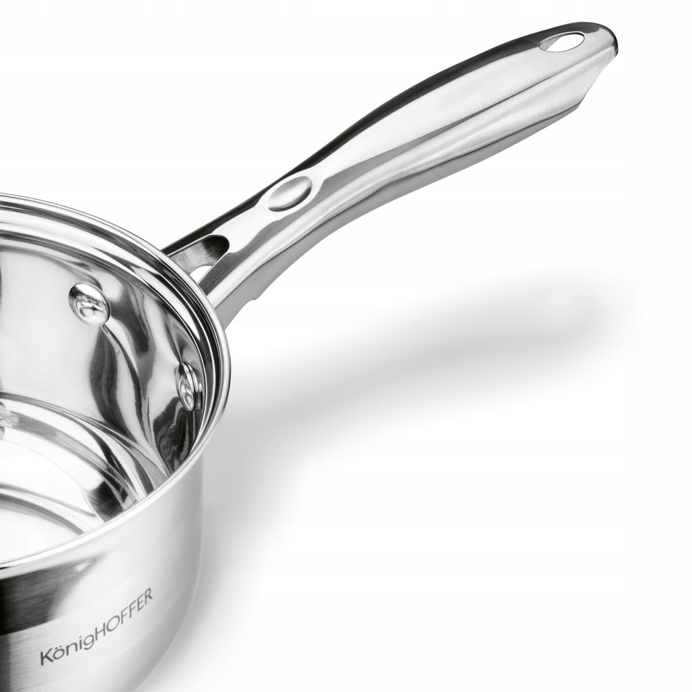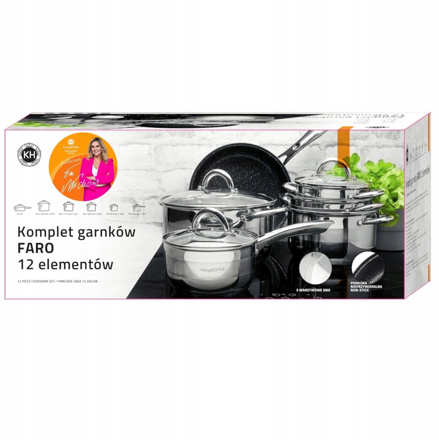 Komplet garnków Konighoffer Faro da ci możliwość energooszczędnego gotowania i smażenia. Różna pojemność naczyń sprawi, że z łatwością dostosujesz cały proces tworzenia dań do liczby i wielkości apetytu gości. W garnkach (pojemność: 1,5/2/3/5 litra), rondlu (1,5 litra) i na patelni (średnica 24 cm) możesz przygotowywać dania, dbając jednocześnie o zawarte w nich witaminy i mikroelementy. Smażąc na amerykańskiej powłoce Xylan unikniesz przywierania składników oraz przypadkowego przypalenia jedzenia. Dzięki wykonaniu zestawu ze stali nierdzewnej nadaje się on do przechowywania posiłków w lodówce. Wszystkie elementy odporne są też na uszkodzenia chemiczne, mechaniczne i termiczne. Co więcej, garnki i patelnia Faro długo utrzymują zaabsorbowane ciepło i pozwalają na wielogodzinne gotowanie. Jakość ich wykonania zagwarantuje ci wieloletnie użytkowanie i bardzo dobrą trwałość. Komplet współpracuje ze wszystkimi rodzajami kuchenek. Świetnie nadaje się też na prezent dla kogoś bliskiego. Produkt ma rekomendację Ewy Wachowicz. Jako ambasadorka marki Konighoffer, gorąco i z uśmiechem poleca go ona do domowego użytku. Razem z nim zdobędziesz twój przepis na dom. To jedna z najlepszych opcji w tej kategorii!