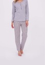 Wygodna i komfortowa piżama damska z wysokiej jakości bawełny. Melanżowa koszulka z długim rękawem. Dekolt i mankiety obszyte lamówką, kolorystycznie nawiązującą do spodni. Spodnie długie, wzorzyste. Skład: