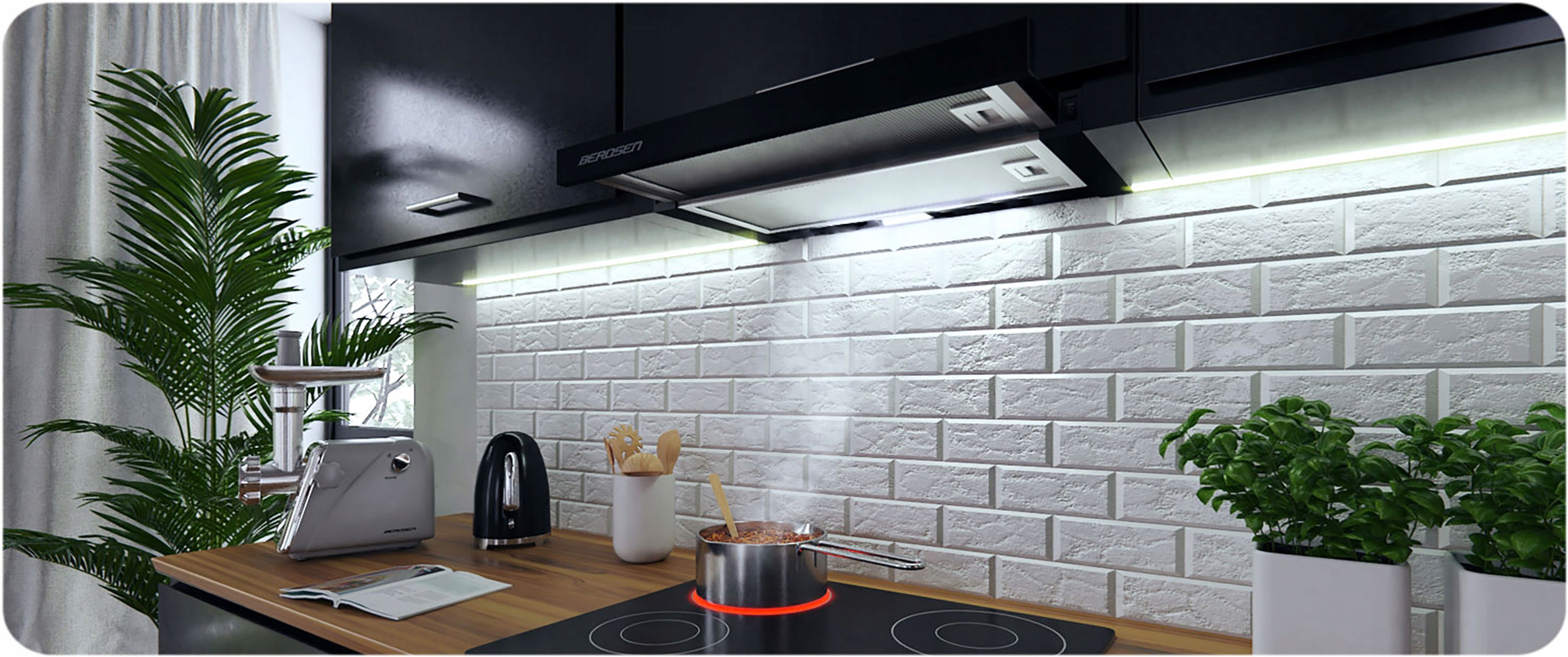 Вместе с вытяжкой в На вашей кухне появится новый источник света-он прекрасно освещает интерьер во время приготовление пищи.