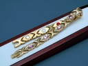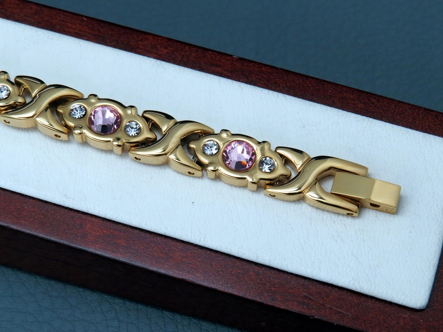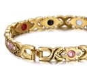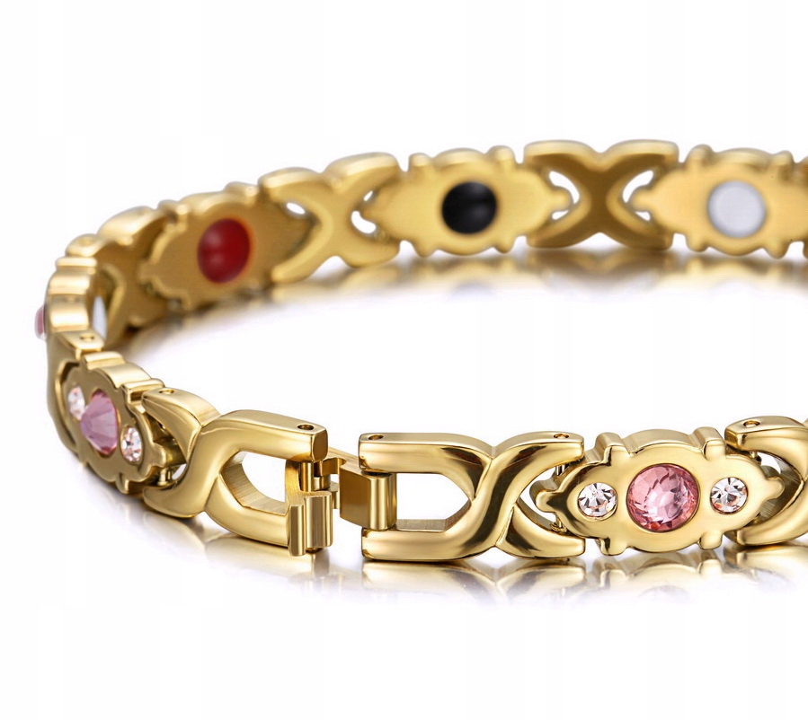 W tej ofercie prezentujemy wyjątkowo elegancki model damskiej bransolety magnetycznej, który wykonany jest z NAJWYŻSZEJ JAKOŚCI STALI CHIRURGICZNEJ 316L platerowanej 18k złotem. Model ten wyróżniają bardzo eleganckie ogniwa połączone z przepięknymi CYRKONIAM Z GĘSTYM SZLIFEM BRYLANTOWYM. Taki układ bardzo efektownie prezentuje się na dłoni i robi niesamowite wrażenie !!! Jest to jeden z najciekawszych i najlepiej sprzedających się modeli w ostatnim czasie !
