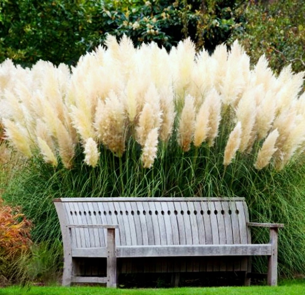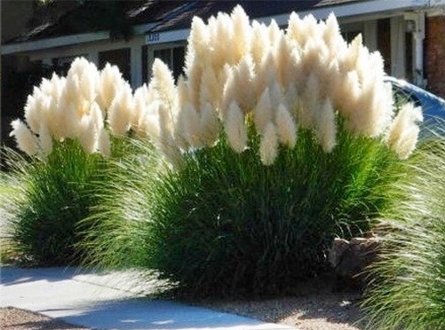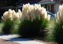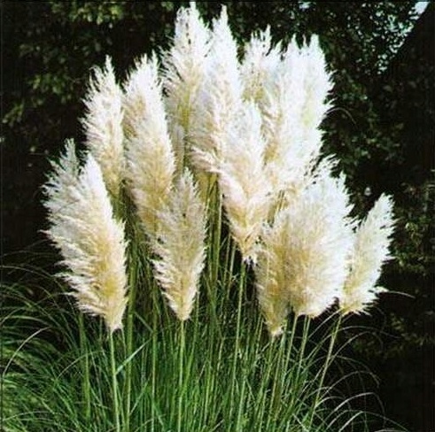 Трава Пампасная белая-самая показная и декоративная из всех трав. Достигает 2,5 м высотой, из центра комка в сентябре вырастают белые перистые соцветия, длиной до 50 см. Цветки устойчивые, могут сохраняться после цветения до поздней осени, а в случае красивой погода украшает наши сады еще зимой.
