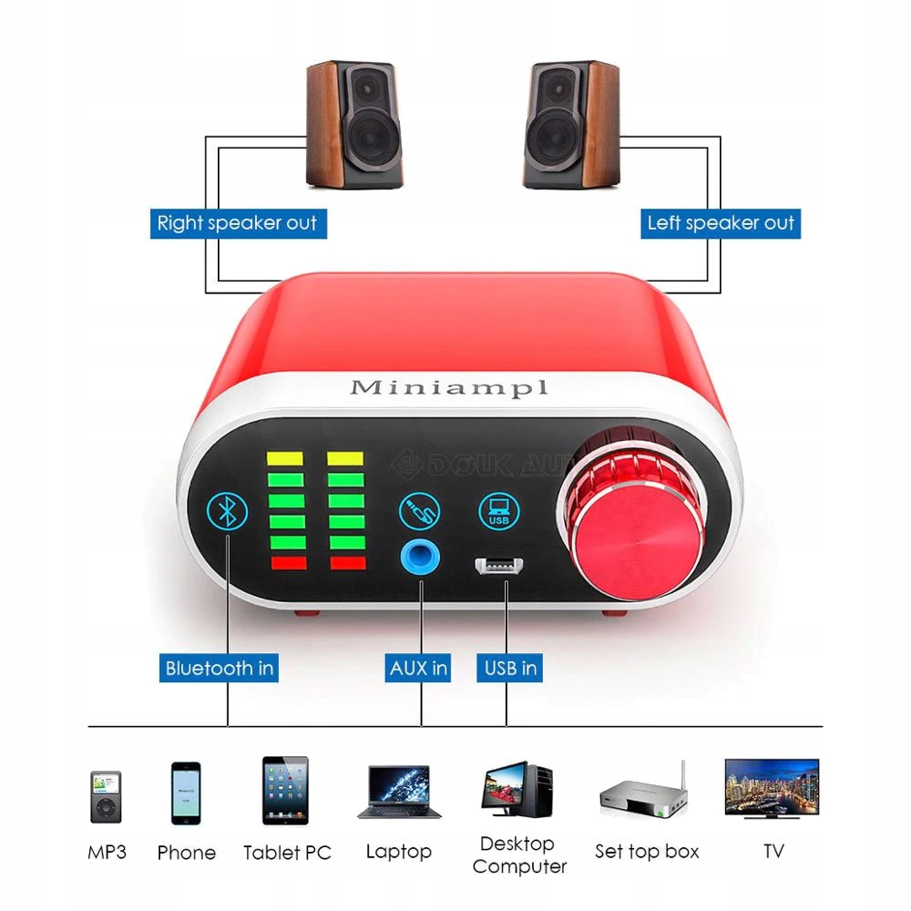 Модуль акустического усилителя мощности с современным дизайном. Высокая выходная мощность 50 Вт для каждого стерео канала. Встроенный приемник Bluetooth позволяет музыкальный плеер с, например. Youtube через смартфон или планшет. Используя интерфейс USB, мы получаем карту аудио на ПК. Конечно, усилитель имеет стандартный линейный вход aux Jack 3,5 мм для подключения CD/DVD-плеера, звуковой карты, MP3-плеера и т. д. Усилитель он оснащен цифровой регулировкой усиления через импульсный (цифровой потенциометр). Кроме того, в устройство встроен индикатор УФ-излучения на светодиодах. Сигналы выход для подключения колонок динамиков реализован с помощью позолоченных разъемов типа банан, что также позволяет напрямую прикручивать провода. Предлагаемый усилитель он характеризуется привлекательной ценой и очень выгодными параметрами в относительно небольшом компактном корпус.