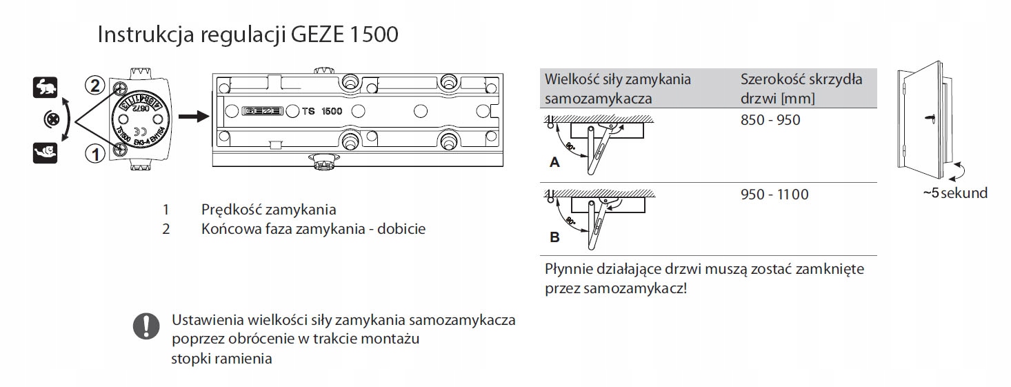 W samozamykaczu nawierzchniowym TS 1500 prędkość zamykania i faza końcowa zamykania (tzw. dobicie) są parametrami regulowanymi, również siła zamykania może być zmieniana. Samozamykacz może być opcjonalnie wyposażony w płytę montażową. TS 1500 może być montowany na drzwiach prawych albo lewych.