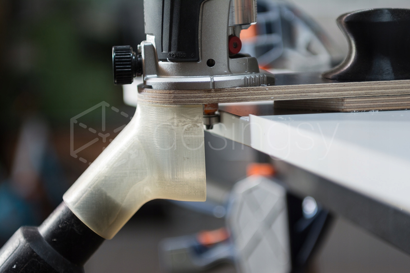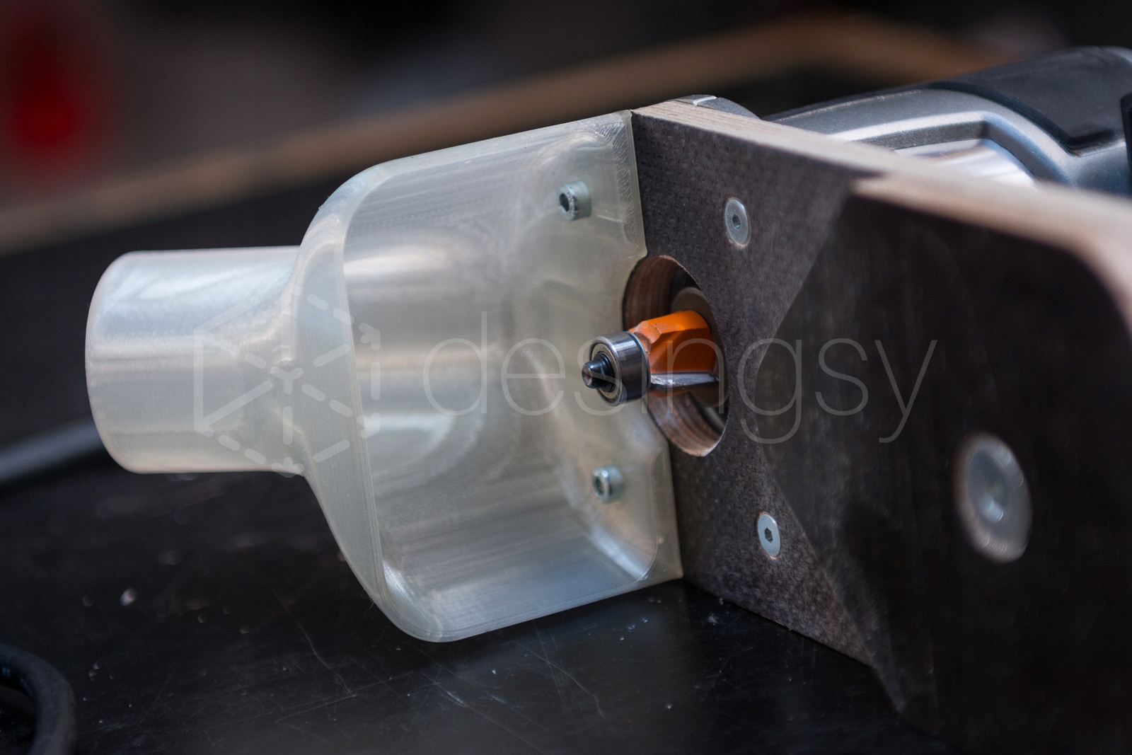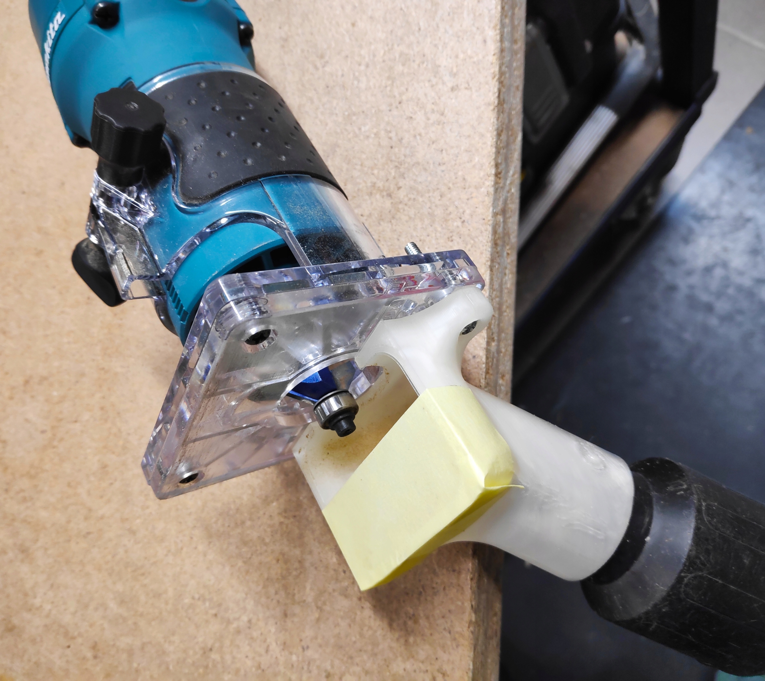 W przypadku fazowania/zaoblania z mniejszym frezem można zwiększyć skuteczność ssania za pomocą uniwersalnego narzędzia, które powinno być w każdym warsztacie - taśma klejąca ;) - na zdjęciu podobny adapter na prostokątnej podstawie.