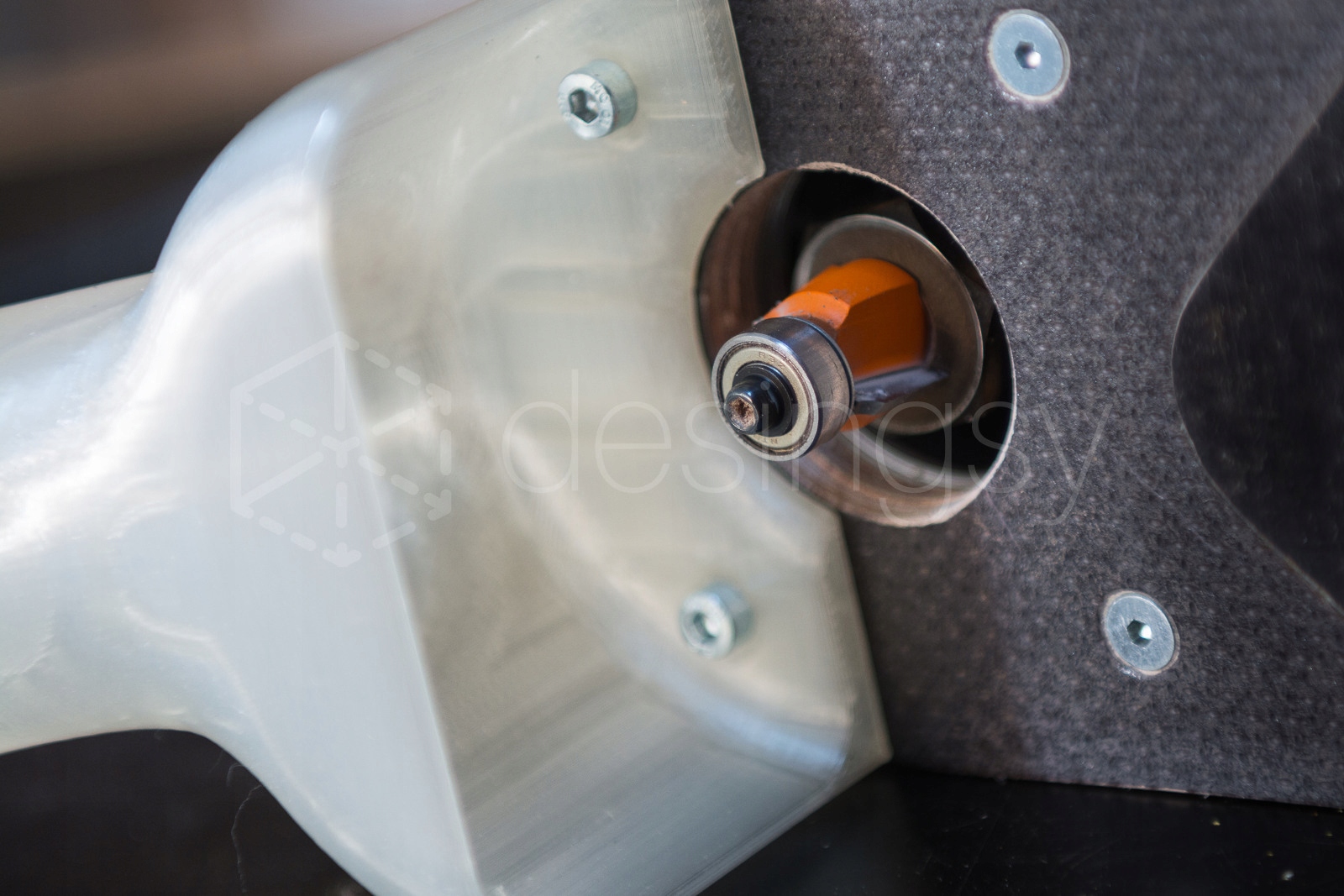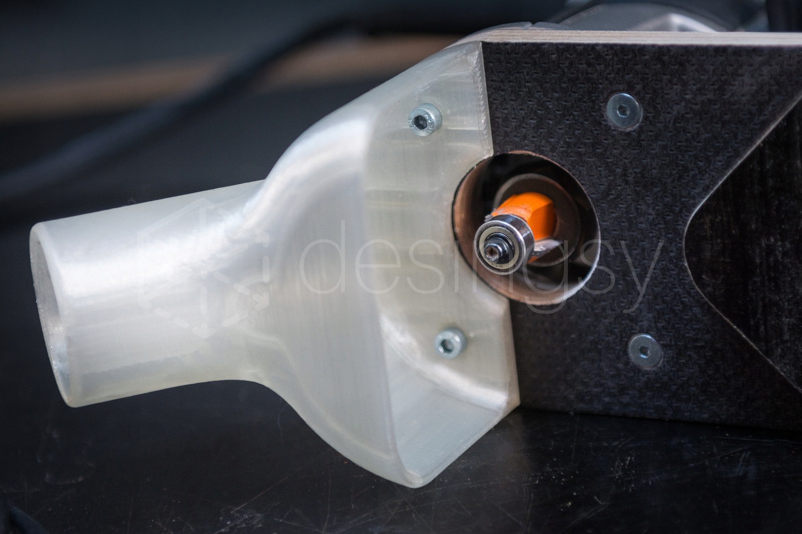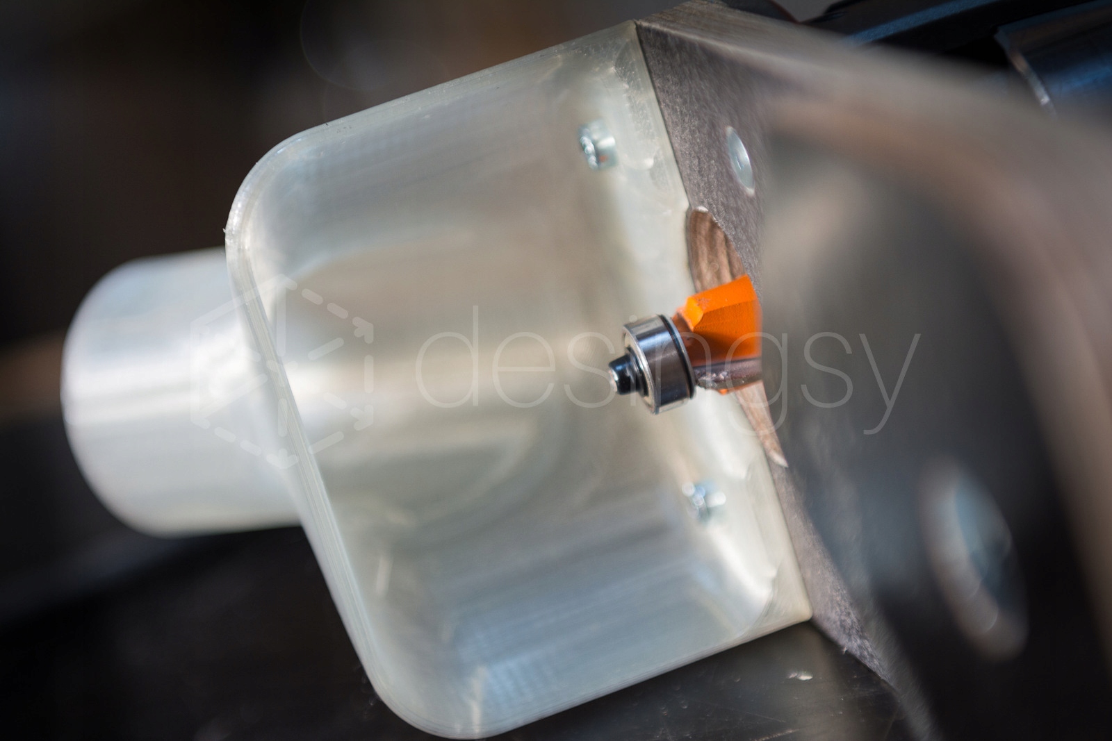 W przypadku fazowania/zaoblania z mniejszym frezem można zwiększyć skuteczność ssania za pomocą uniwersalnego narzędzia, które powinno być w każdym warsztacie - taśma klejąca ;) - na zdjęciu podobny adapter na prostokątnej podstawie.