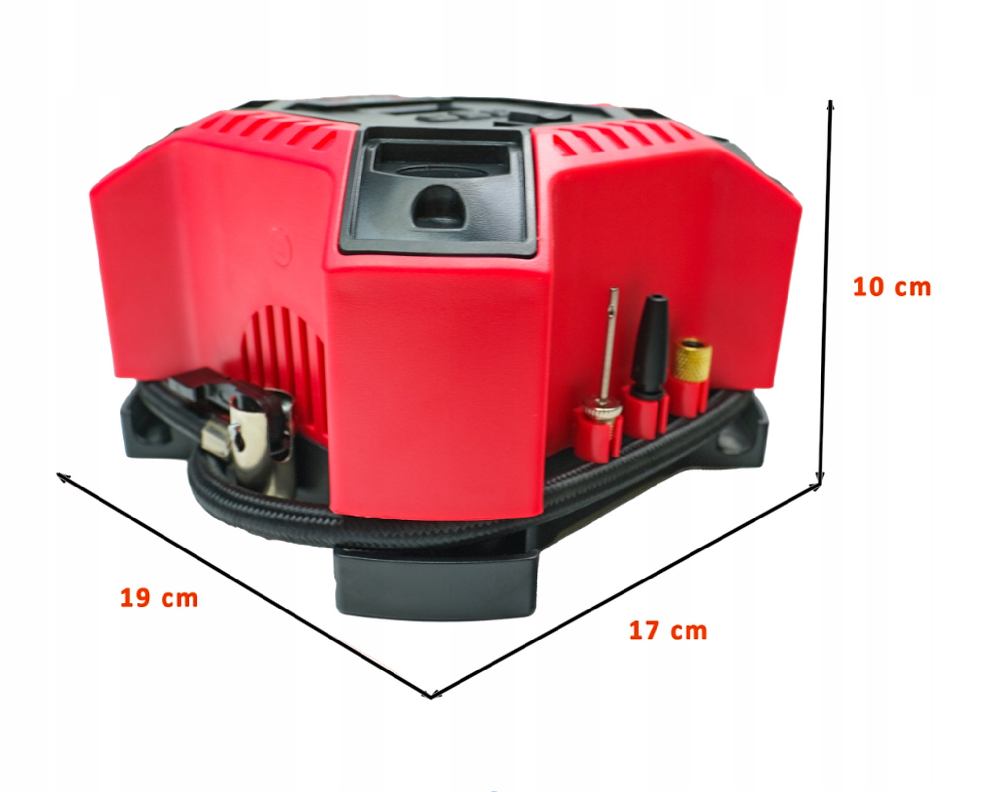 Wtyk zasilania 12V (pod samochodową zapalniczke) pozwala na pompowanie w miejscach gdzie nie ma dostępu do sieci elektrycznej.