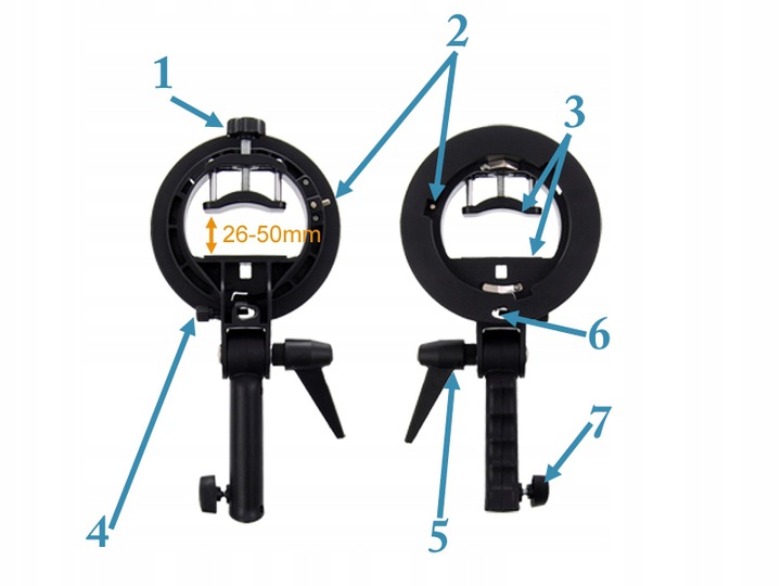 Uchwyt uniwersalny do lampy błyskowej zakończony adapterem typu Bowens, pozwala na używanie dowolnych akcesoriów (softboxy, strumienice itp) z mocowaniem typu Bowens z dowolną lampą błyskową.