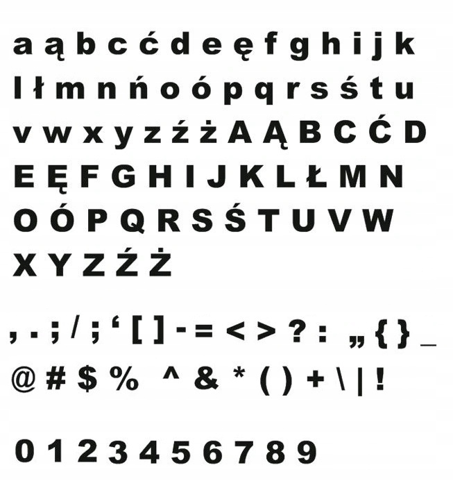 Pierwsza wielka litera ma wysokość 25cm, reszta proporcjonalna do pierwszej.