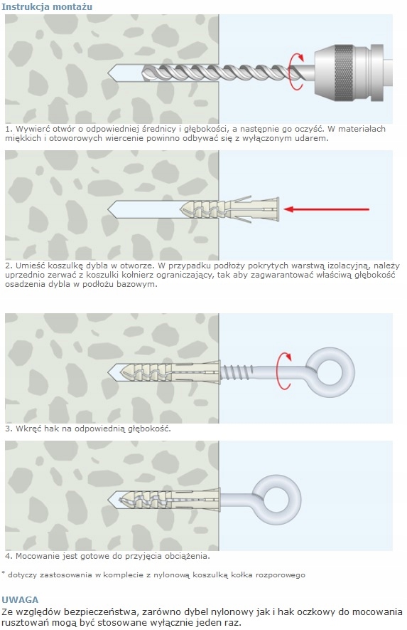po zastosowaniu nylonowego dybla rozporowego, do montażu w betonie klasy B25 lub wyższej, kamieniu naturalnym i pełnej cegle.