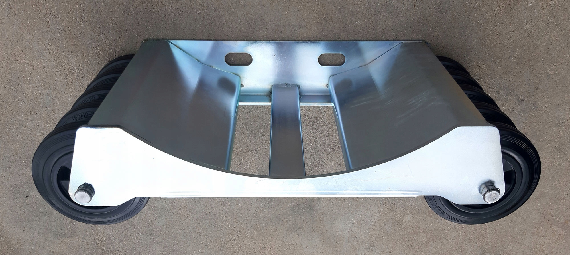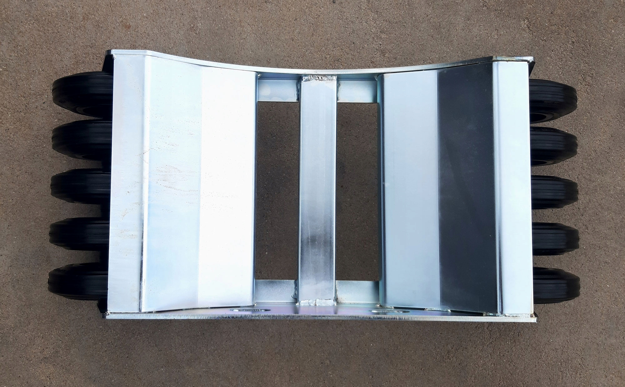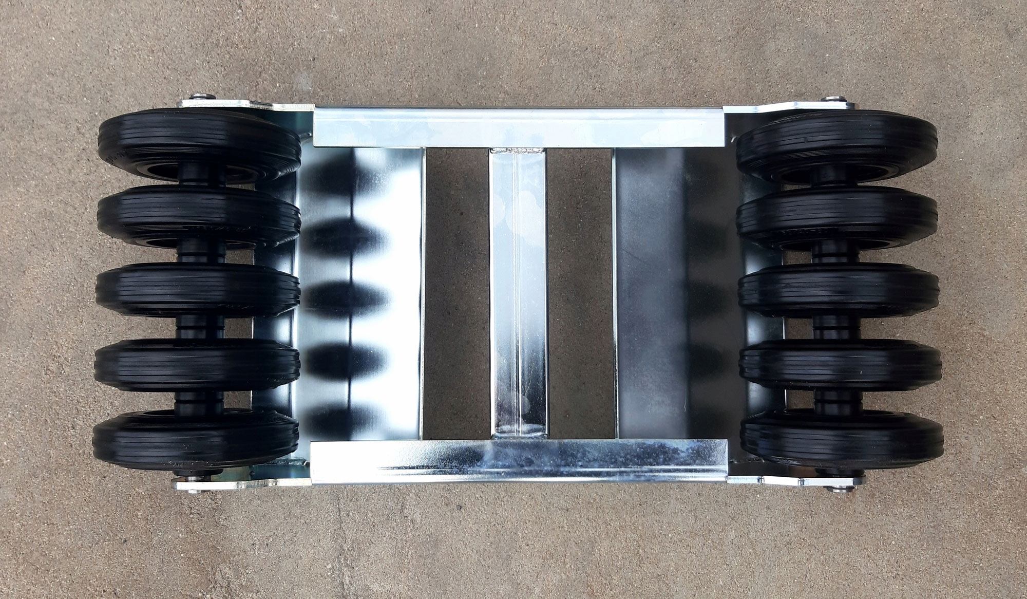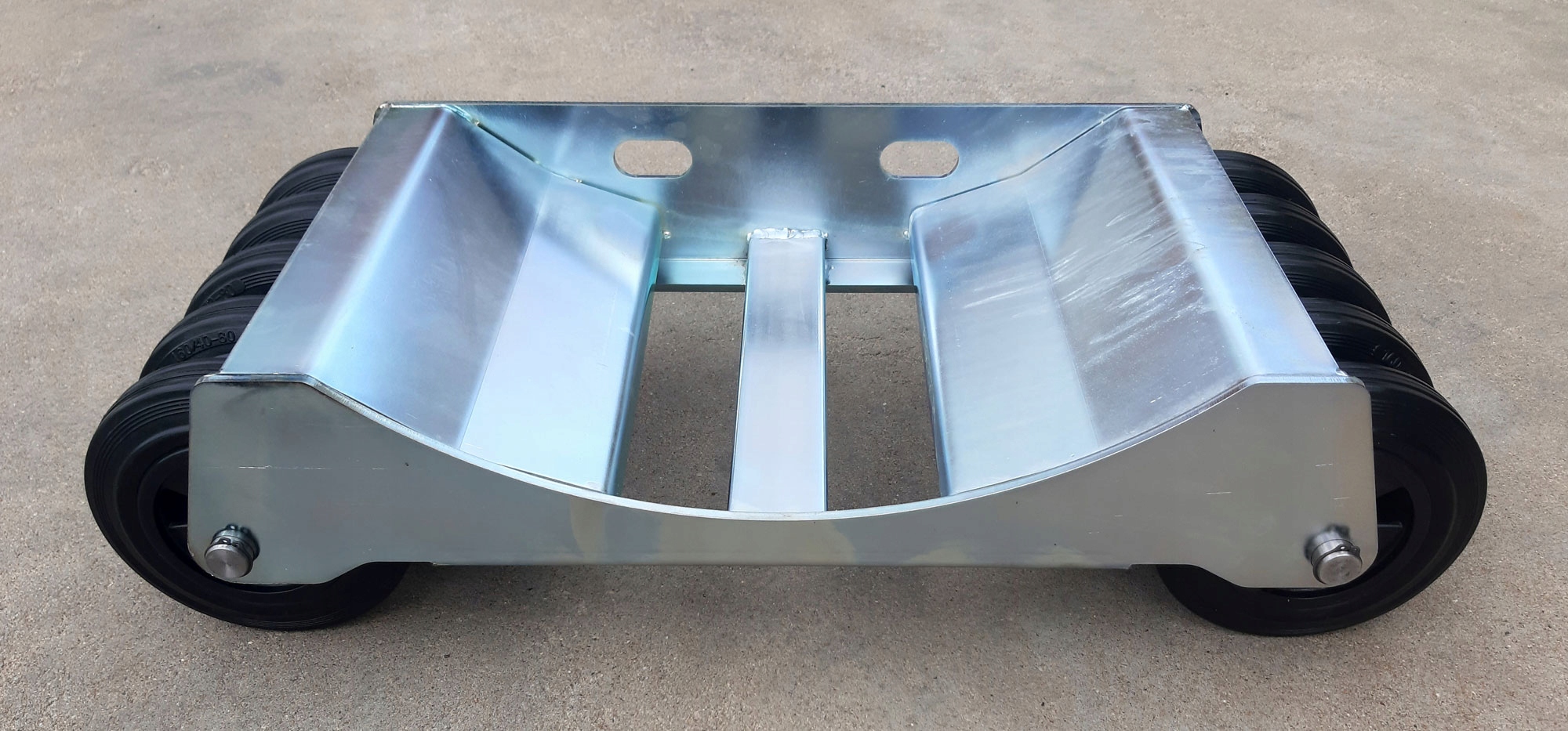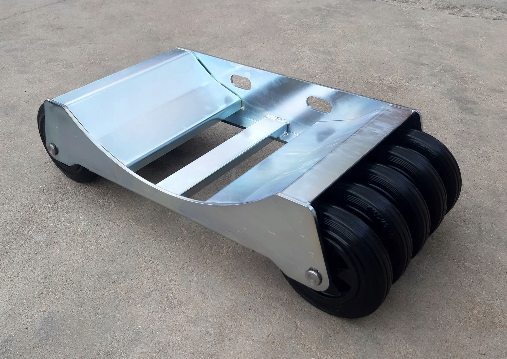 Наши тележки изготовлены из листового металла марки S355 толщиной 5 и 6 мм, обожженного лазером с подгиб в нижней части, чтобы укрепить и укрепить тележку. Поперечины из углового бруса 40x40 / 4 и профиль 50x20 / 3. Вся металлическая конструкция сварена и оцинкована. W мы использовали более дорогие полиамидные колеса роликовые подшипники с резиновым протектором. Колесики, прикрепленные к тележке осями марки стали C45 диаметром Ø20 обеспеченными кольцами Сегера.