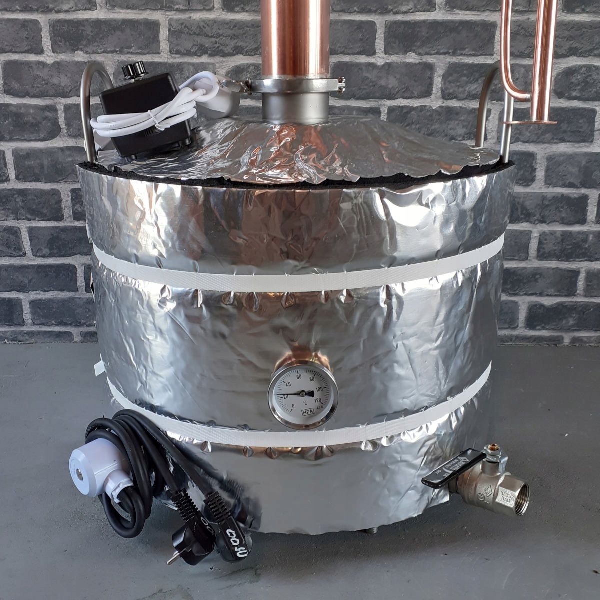 Kocioł jest ocieplony matą kauczukową (K-Flex 10 mm) z ochronną zewnętrzną warstwą aluminium. Ocieplenie poprawia komfort pracy, zwiększa szybkość destylacji, oszczędza prąd i jest bezpieczniejsze. Powłoka aluminium zabezpiecza przez uszkodzeniami maty - nawet mocne uderzenie czy zadrapanie nie zostawi śladu (tak jak na gołej macie kauczukowej, która niszczy się po kontakcie z innym przedmiotem). Dzięki powłoce, kocioł łatwo i szybko można umyć.