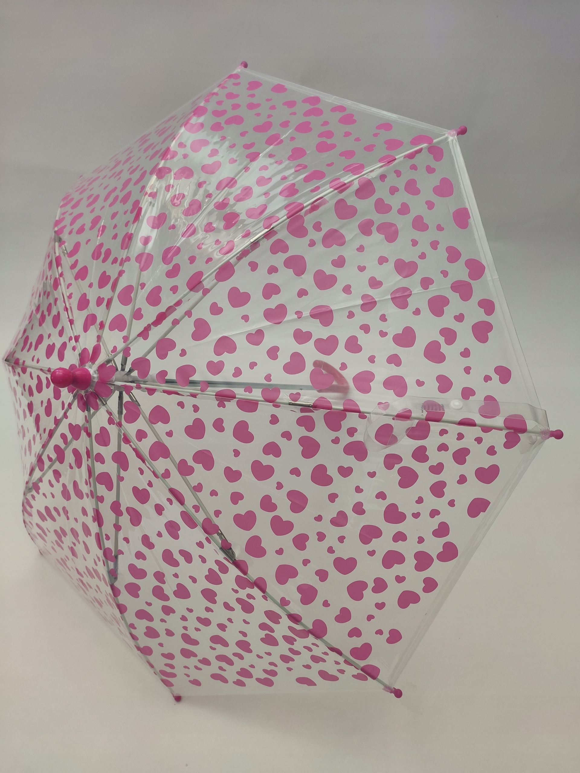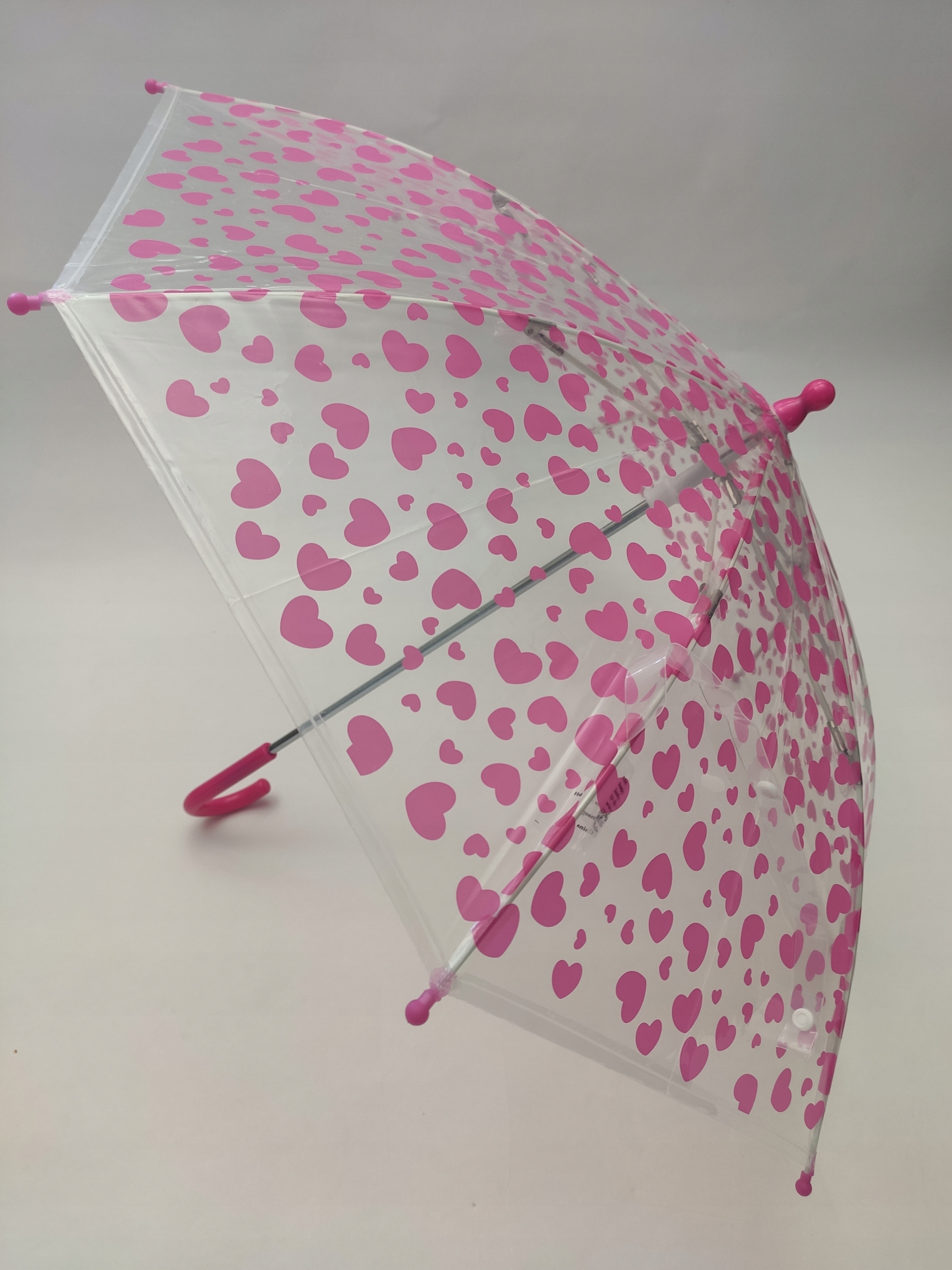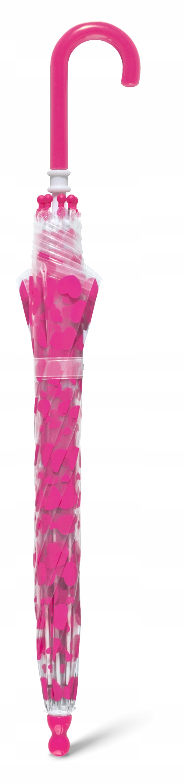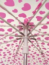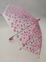 Uroczy, dziecięcy, przeźroczysty, parasol w różowe serduszka, to idealna propozycja dla małych dziewczynek na deszczowe dni.