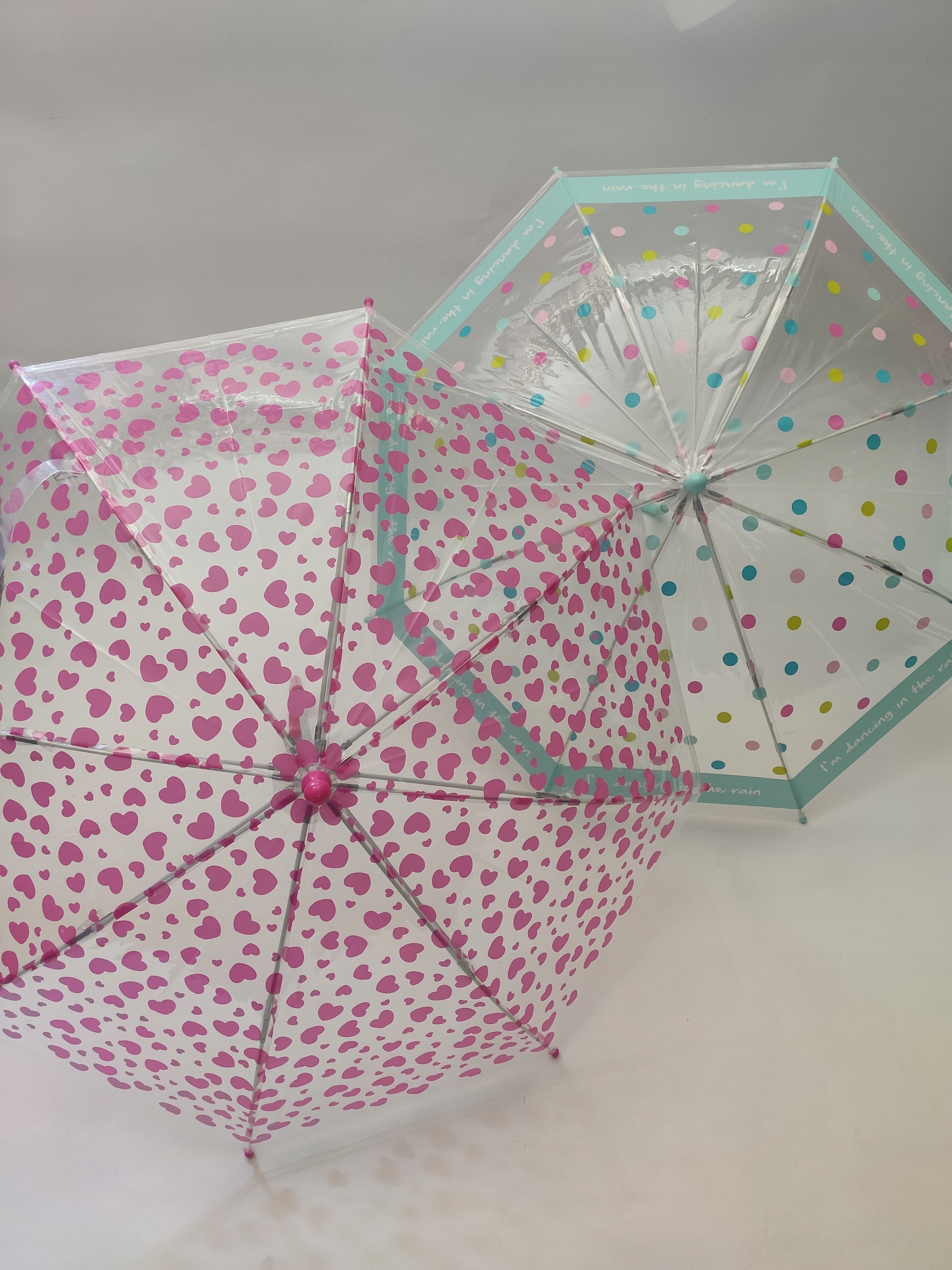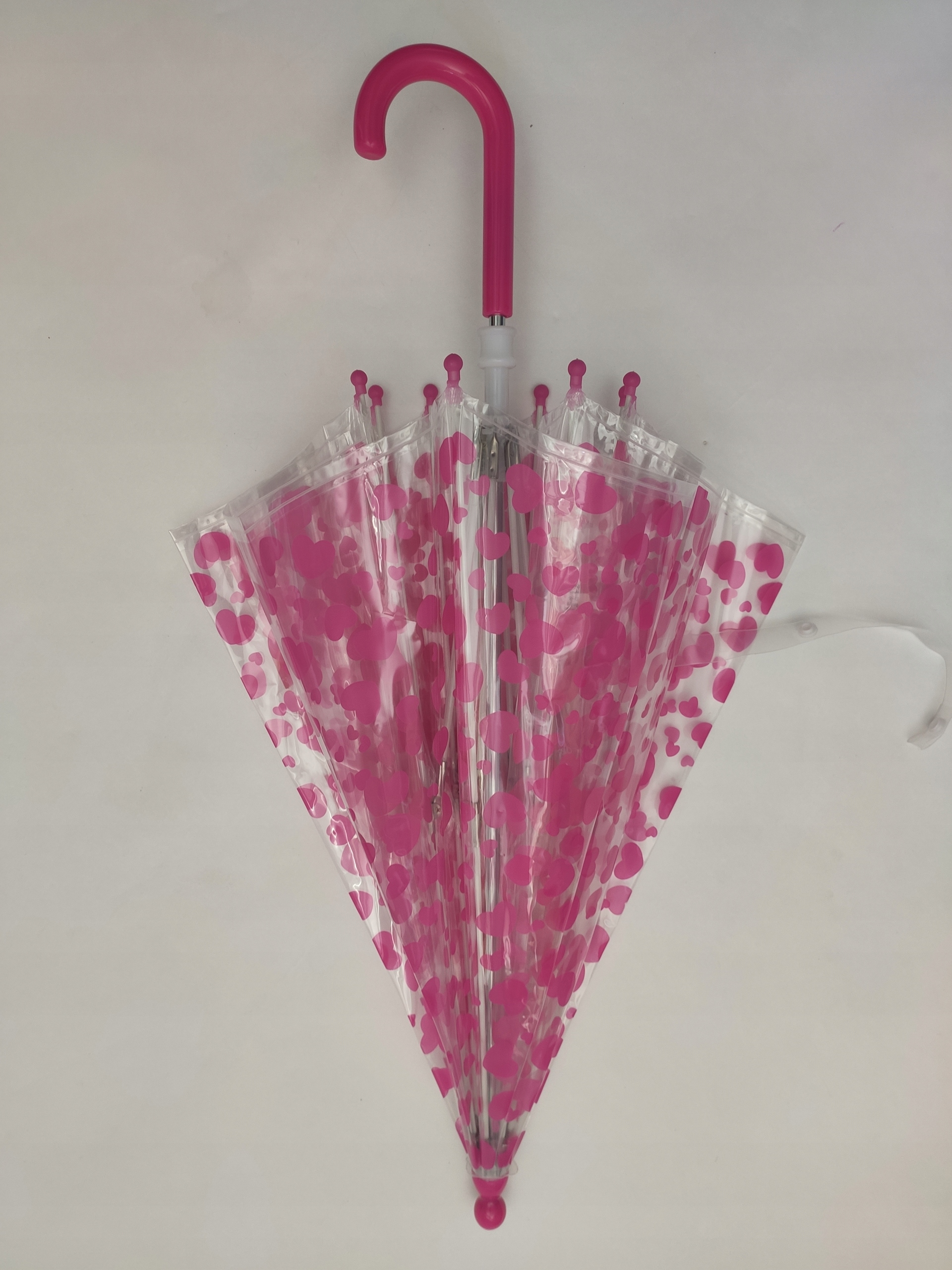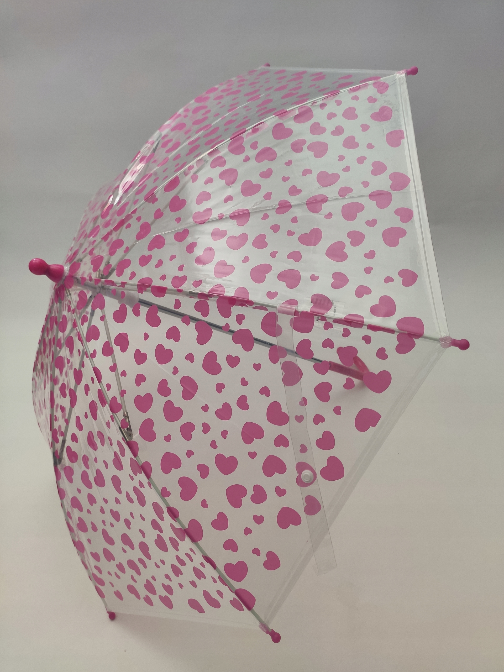 Uroczy, dziecięcy, przeźroczysty, parasol w różowe serduszka, to idealna propozycja dla małych dziewczynek na deszczowe dni.
