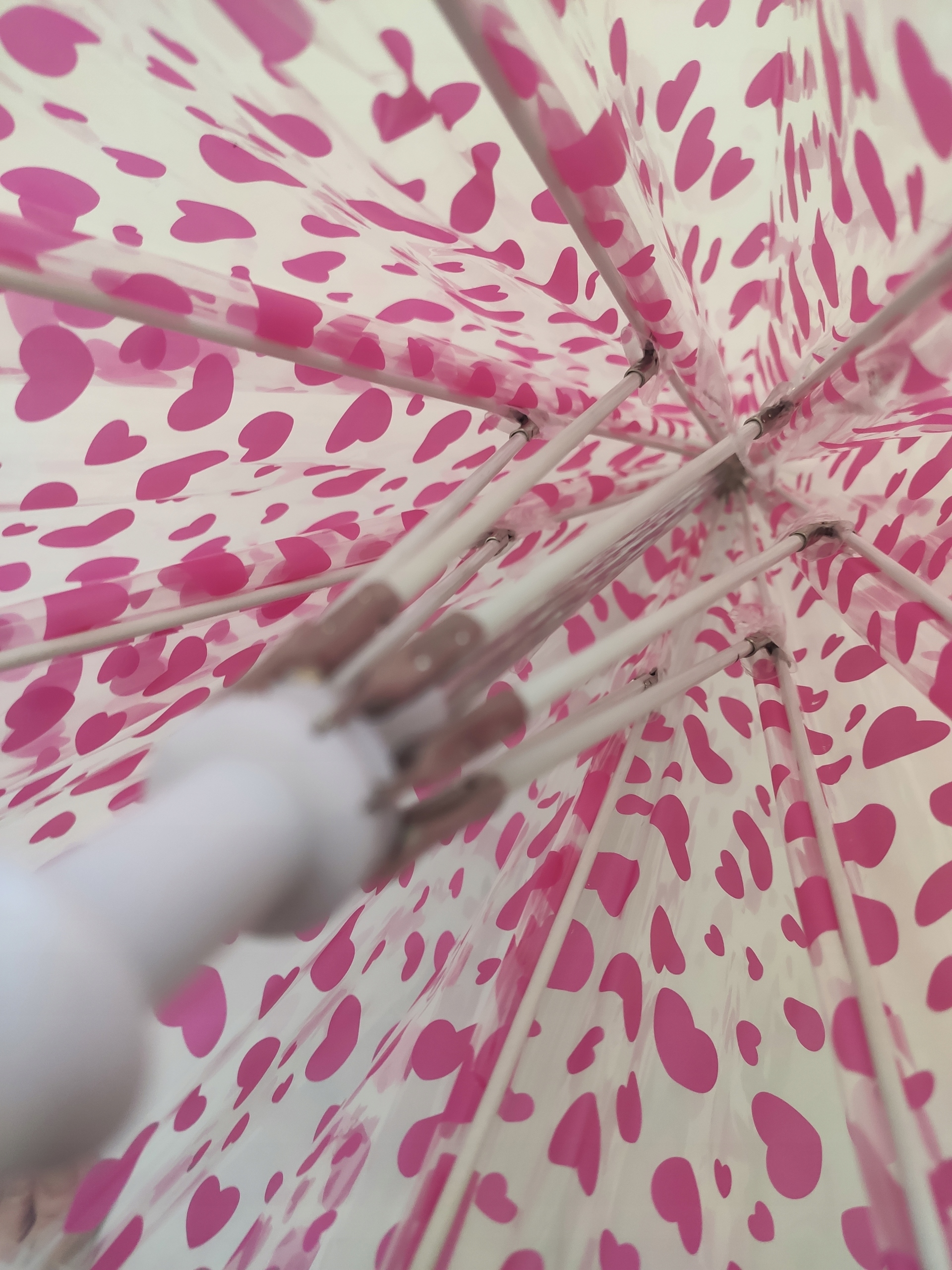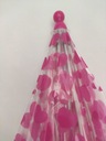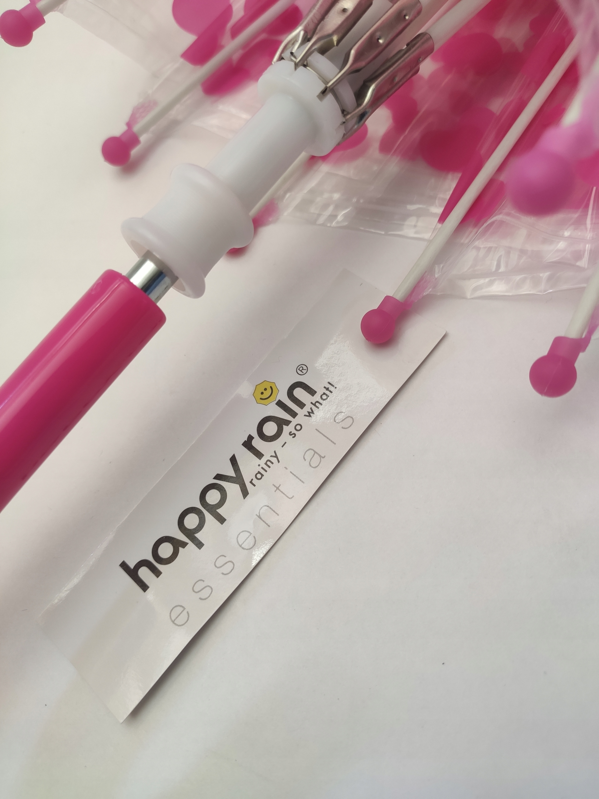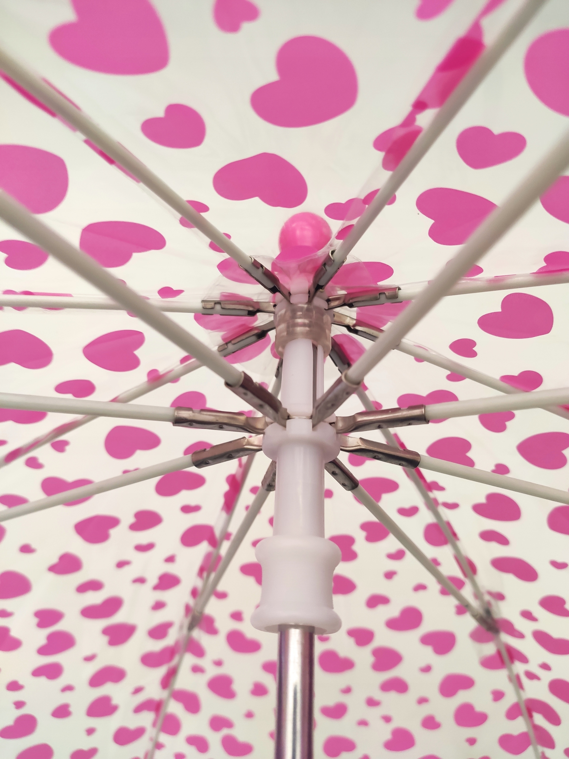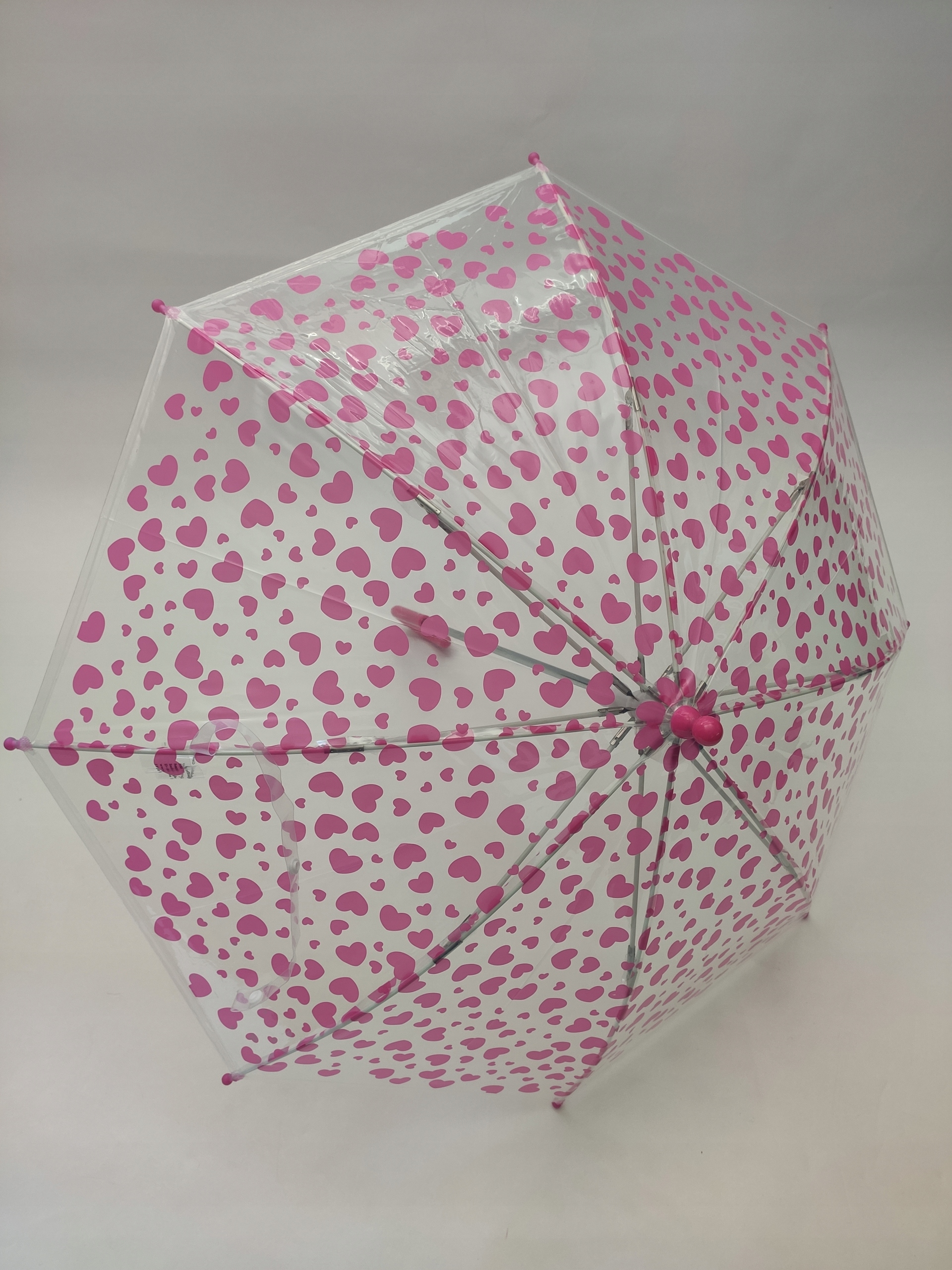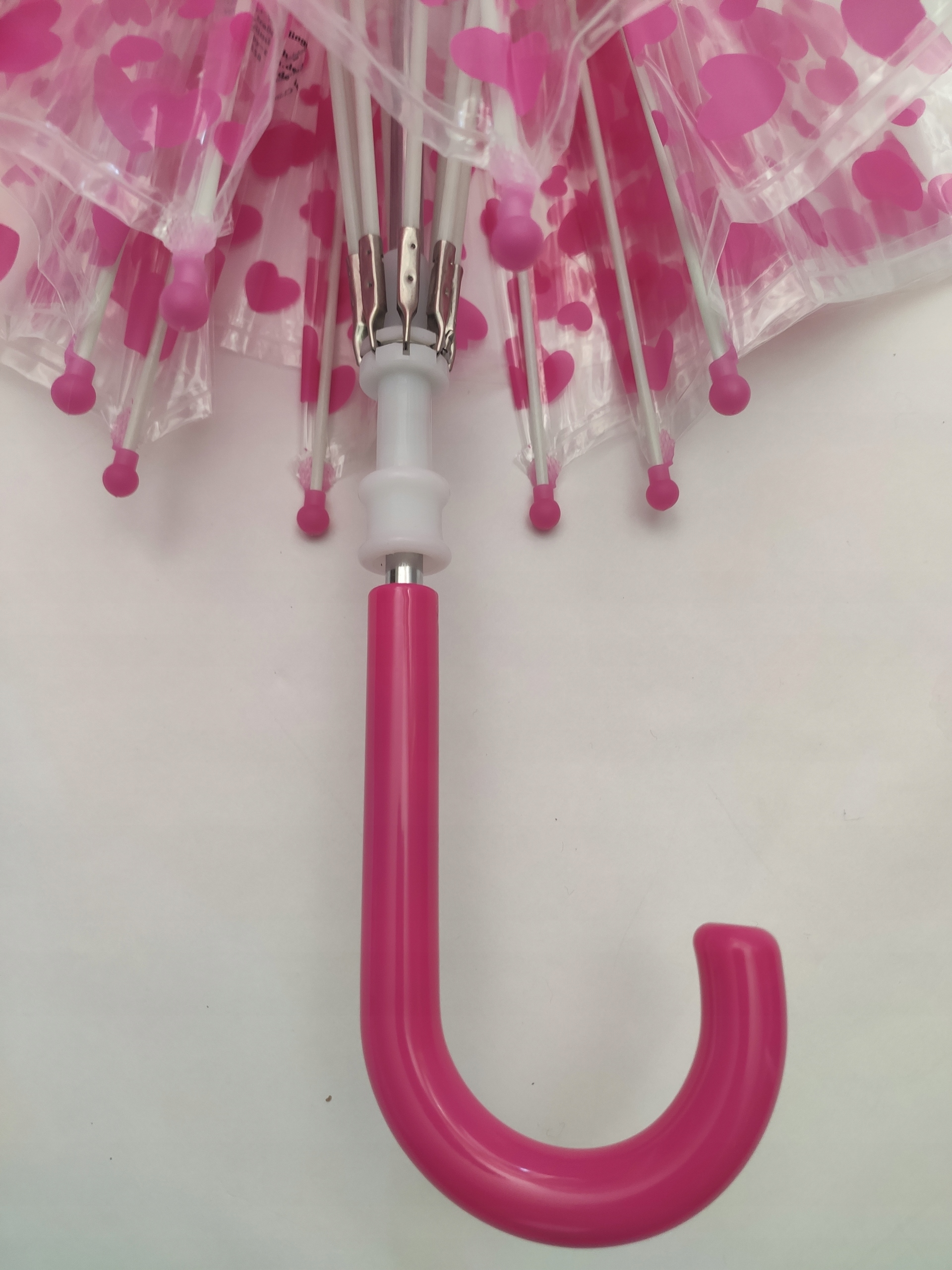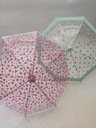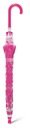 Lekka konstrukcja z 8 napinających drutów i włókna szklanego, została pokryta grubą przeźroczystą folią, trzon parasolki o dł. 57 cm. został zakończony zagiętą różową rączką.