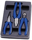 Komplet szczypiec we wkładzie do wózka warsztatowego King Tony. W zestawie znajdują się standardowe kombinerki, cążki obcinające oraz szczypce wąskie