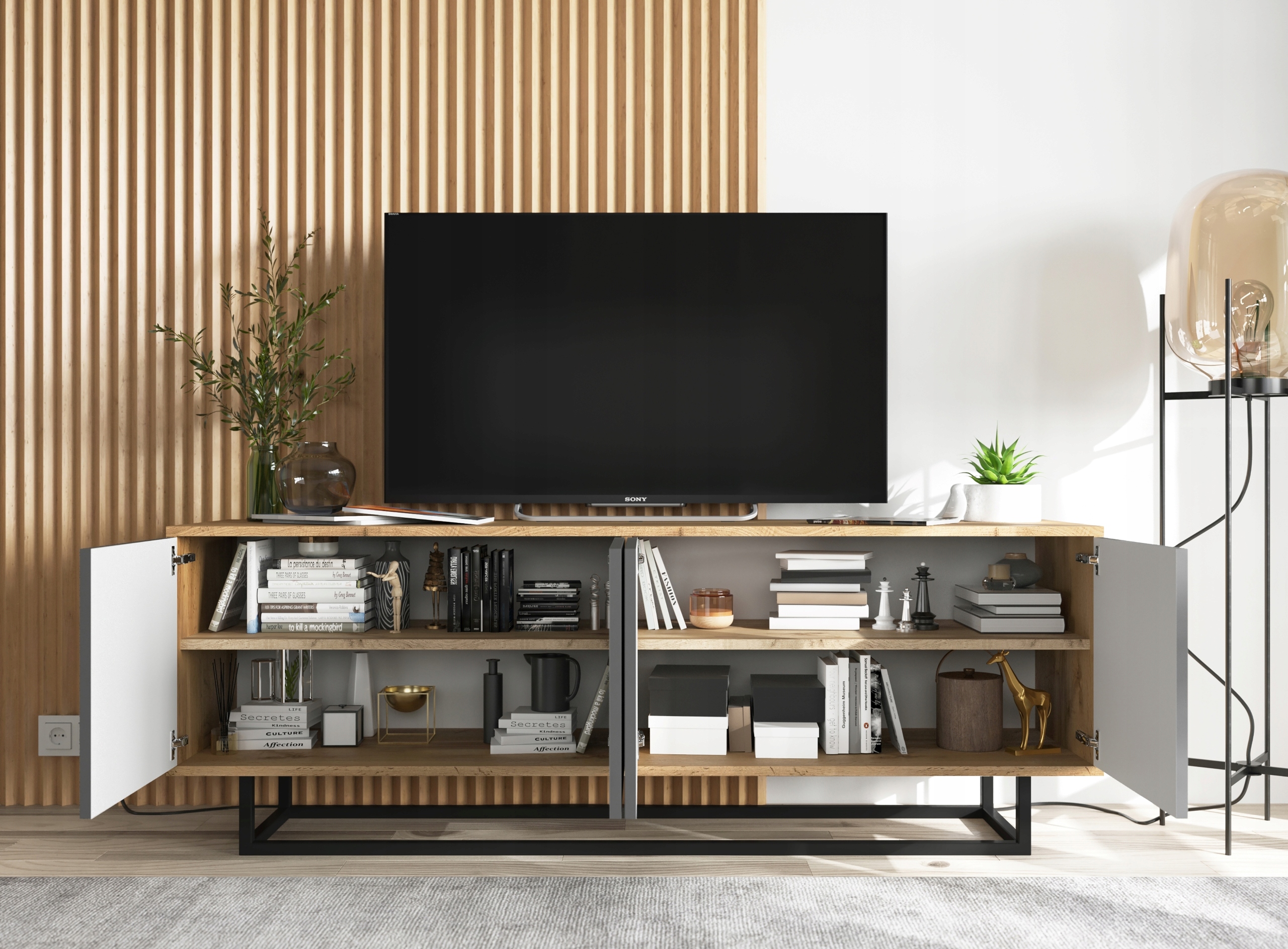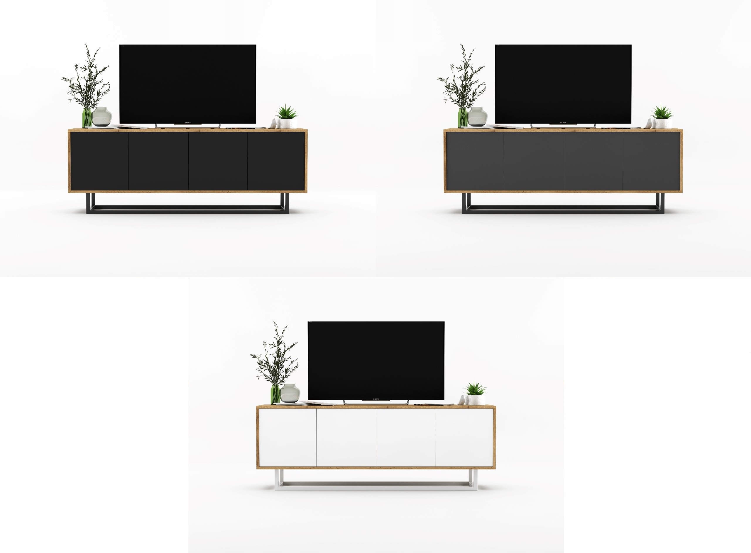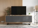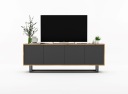 Nowoczesna cztero-drzwiowa szafka RTV podzielona na dwie dwupoziomowe komory zamykane. Wygodny system "push to open" do otwierania drzwiczek.