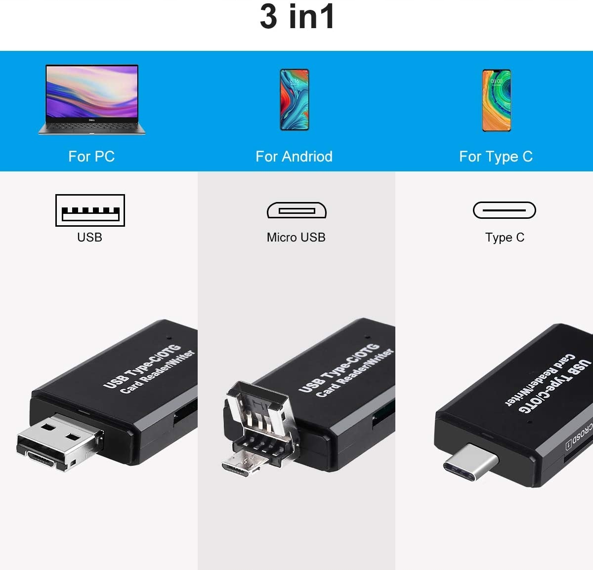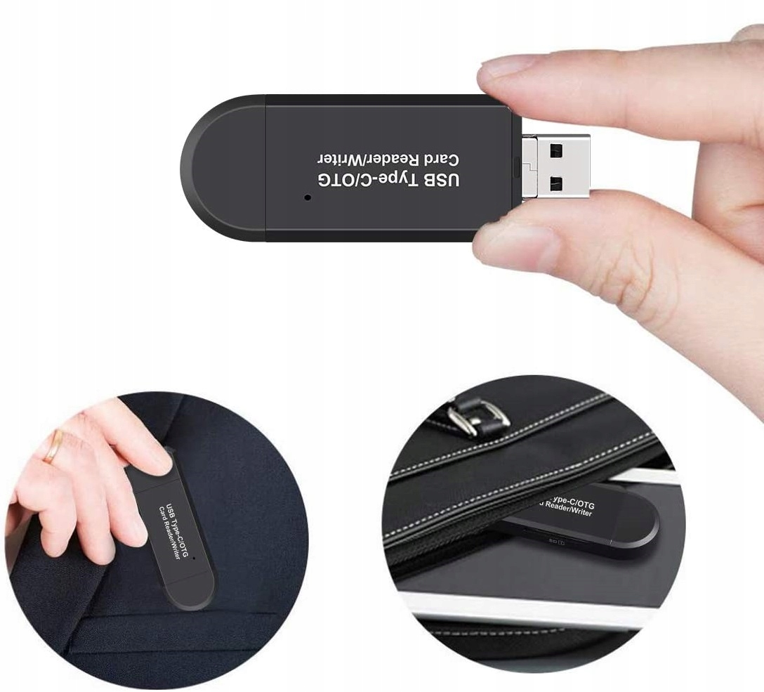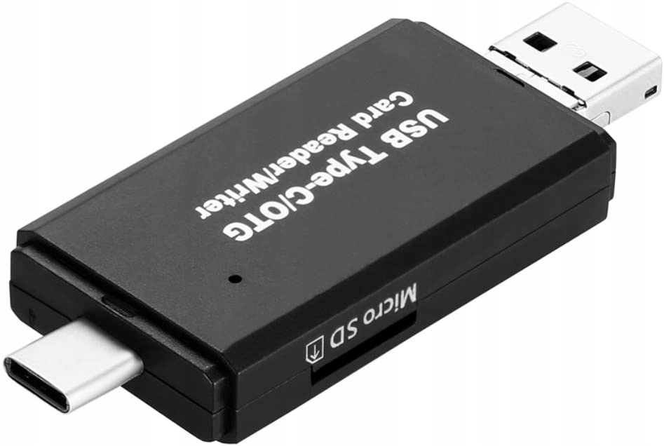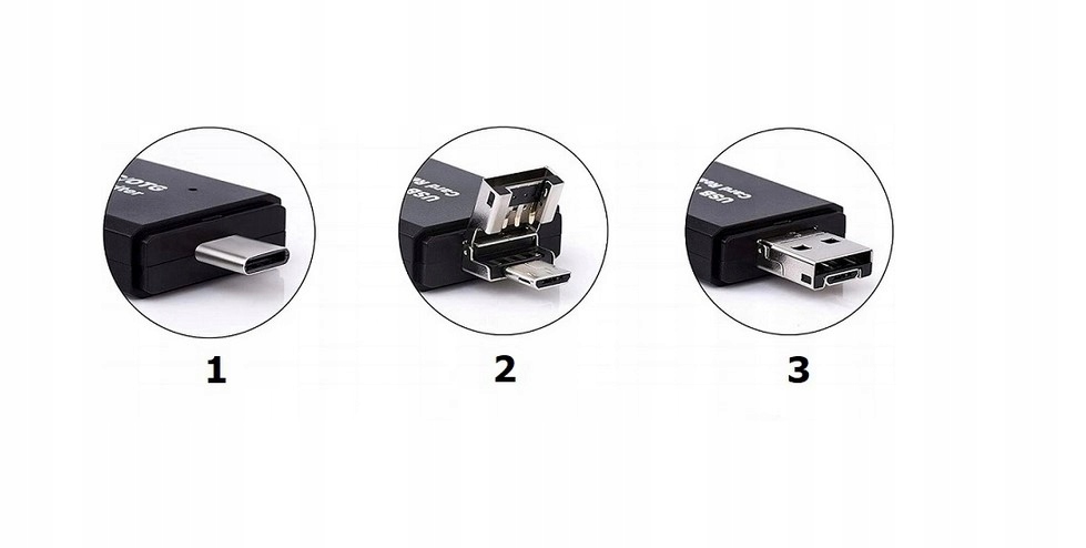 Dzięki unikatowej budowie, czytnik wyposażony został w 3 złącza USB w kilku różnych standardach: USB 2.0 / USB-C USB-C 3.1 Typ C / Micro USB. Od teraz nie musisz mieć wielu przewodów z różnymi końcówkami, aby podłączyć do komputera kartę pamięci i zgrać z niej dane.