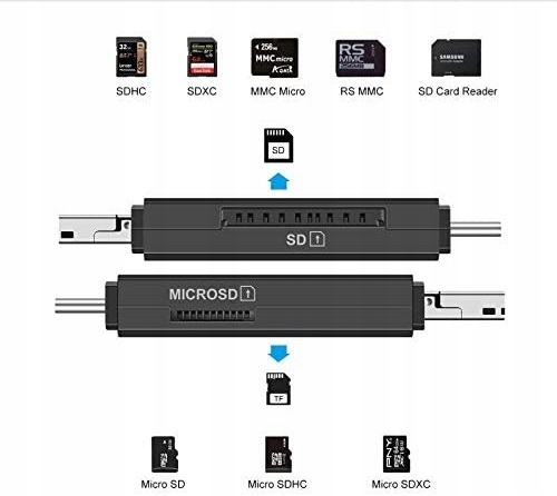 Wygodne. kompaktowe urządzenie do odczytywania kart SD i TF. Umożliwia odczyt i zapis danych z kart pamięci na urządzenia z systemem Windows, Mac OS, Linux oraz Android. Czytnik pozwala odczytać dane także na urządzeniach mobilnych takich jak telefony czy tablety.