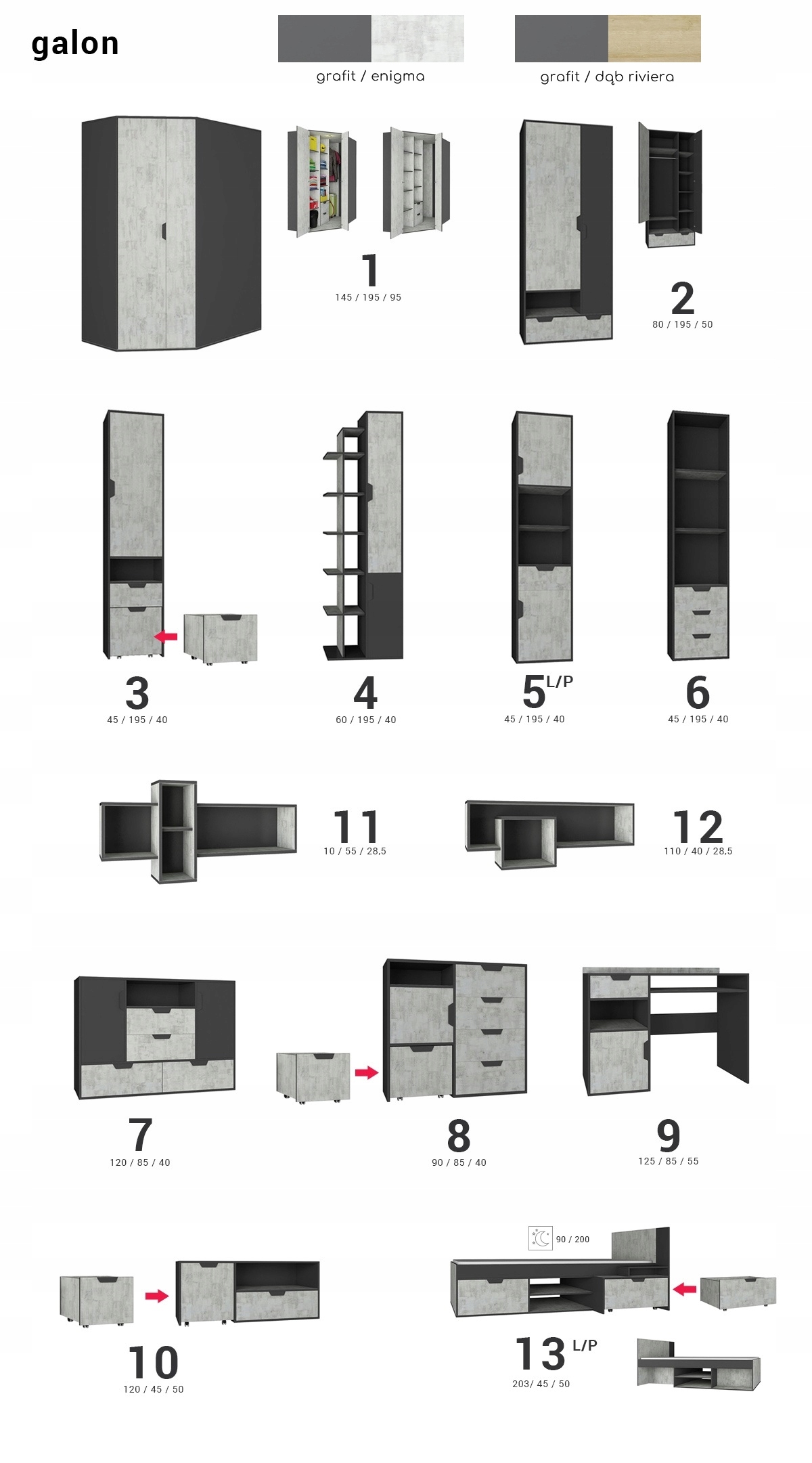 Meble GALON idealnie sprawdzą się w pokoju zarówno dziecięcym jak i młodzieżowym. Wszystkie elementy można kupować pojedynczo i tworzyć własne, niepowtarzalne ustawienia dzięki czemu, w pełni można wykorzystać wszystkie atuty zarówno mebli jak i urządzanego pokoju. Krawędzie wykończone okleiną ABS. Niepowtarzalna struktura frontów o tajemniczej nazwie ENIGMA na pewno doda uroku pomieszczeniu.