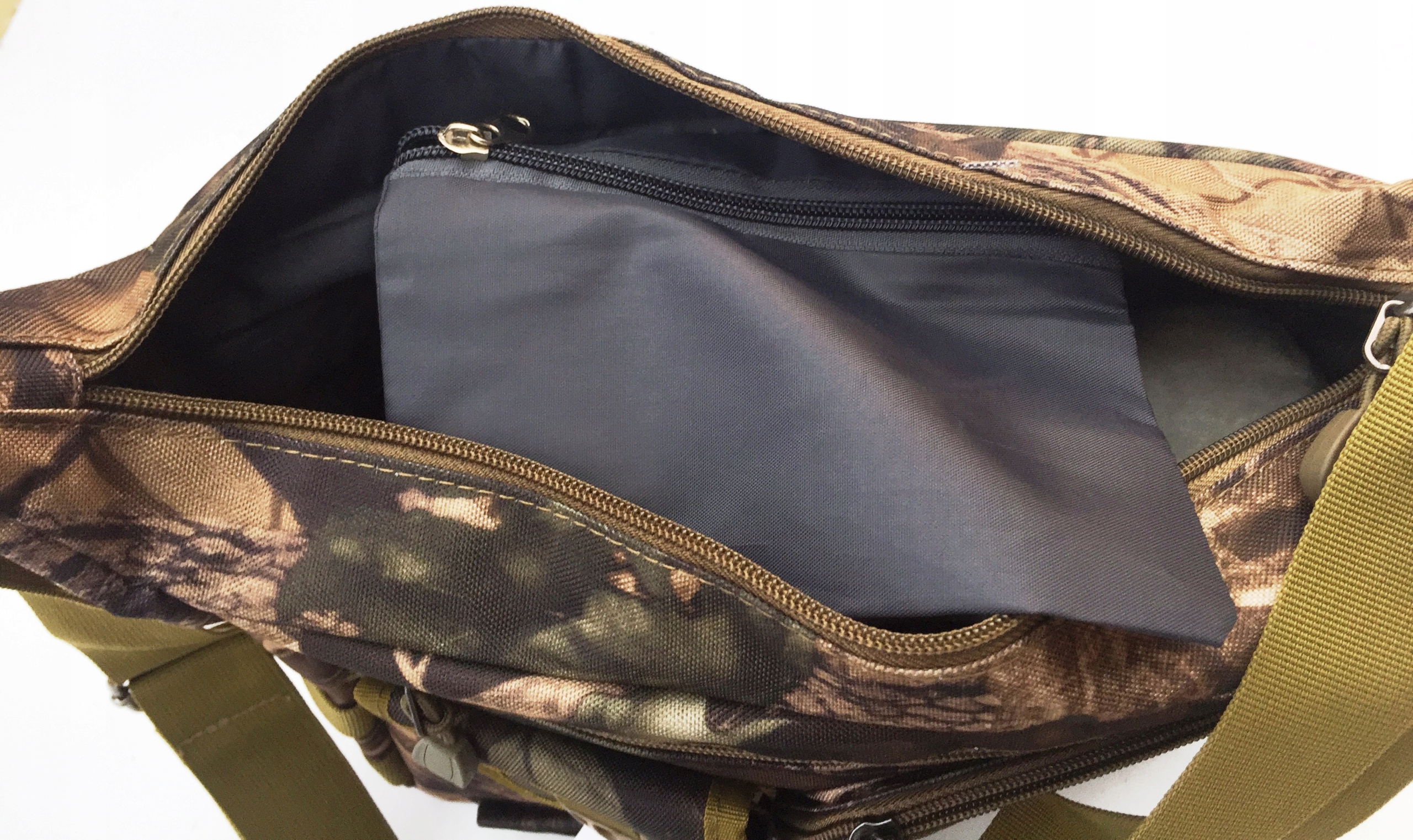 Na froncie pojemna kieszeń na zamek, dodatkowo kieszonka na rzep, z dużym D-Ring-iem oraz kieszeń kargo i płaska ,również na suwak,