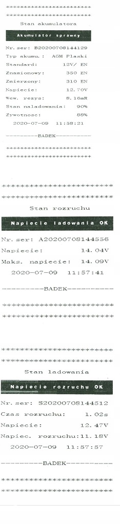 Jako wynik TESTU AKUMULATORA podana jest wartość rzeczywistego prądu rozruchu: