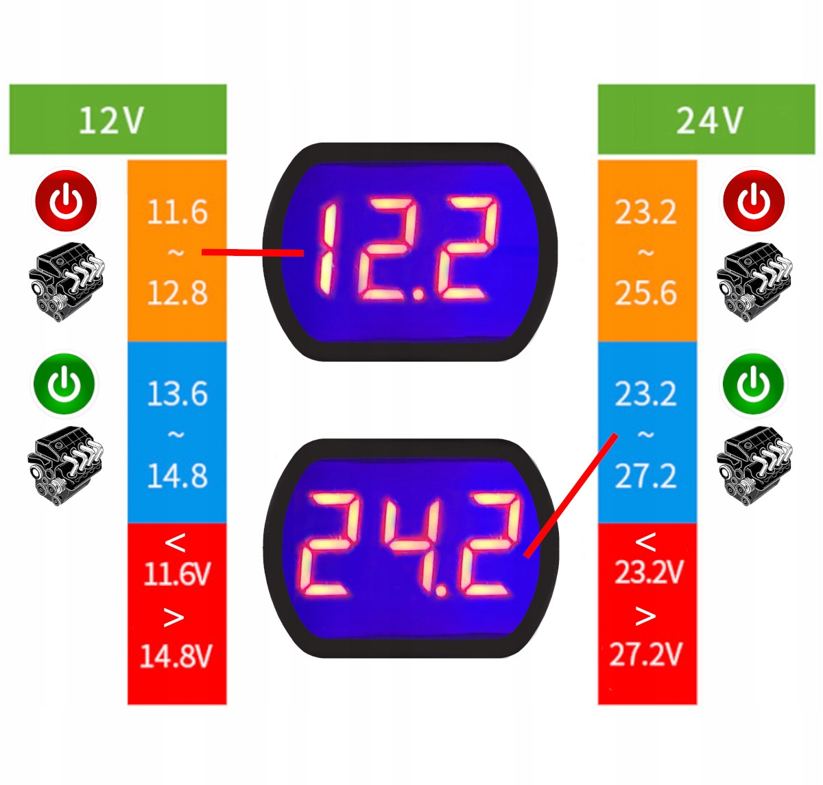 Napięcie mniejsze niż 11,6 lub większe niż 14,8 - nieprawidłowe napięcie.