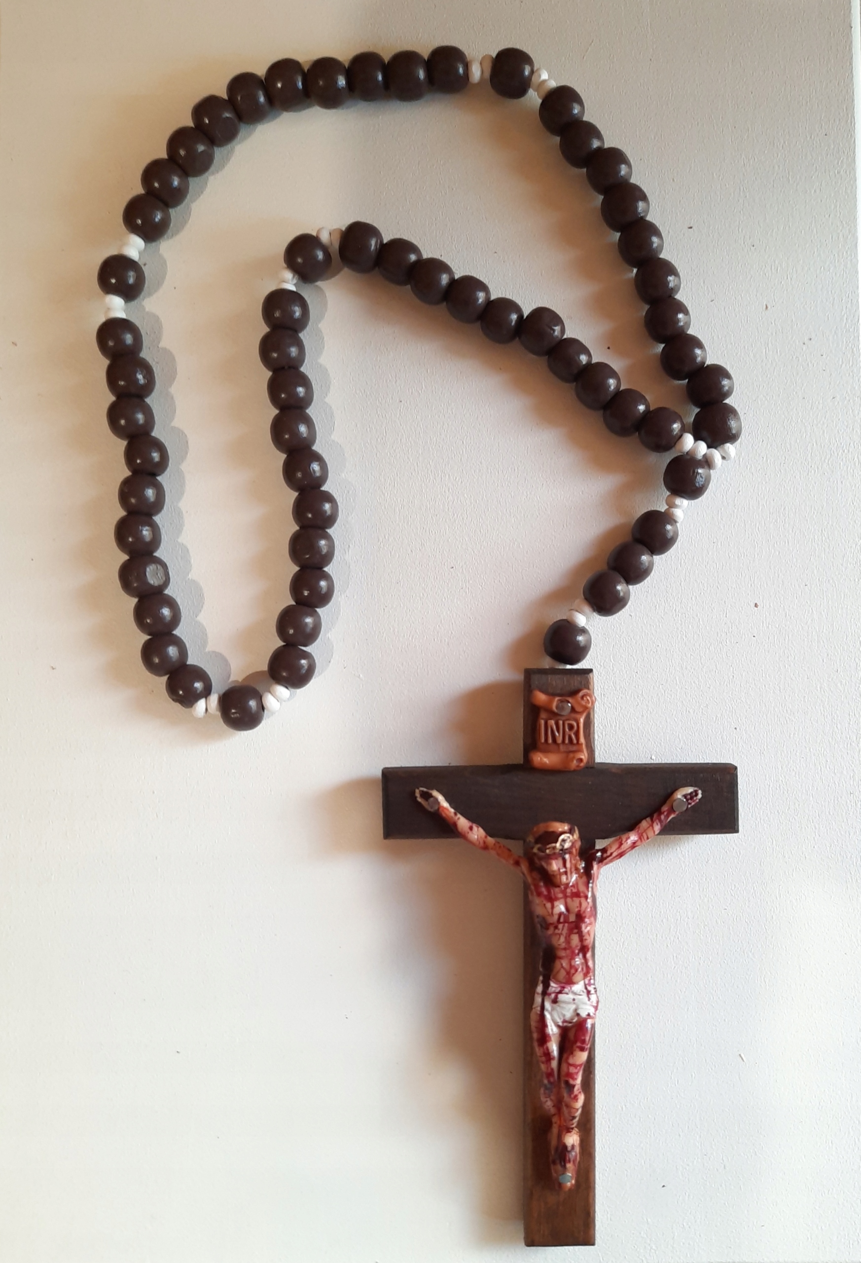 Krzyz jest zamocowany na różańcu.