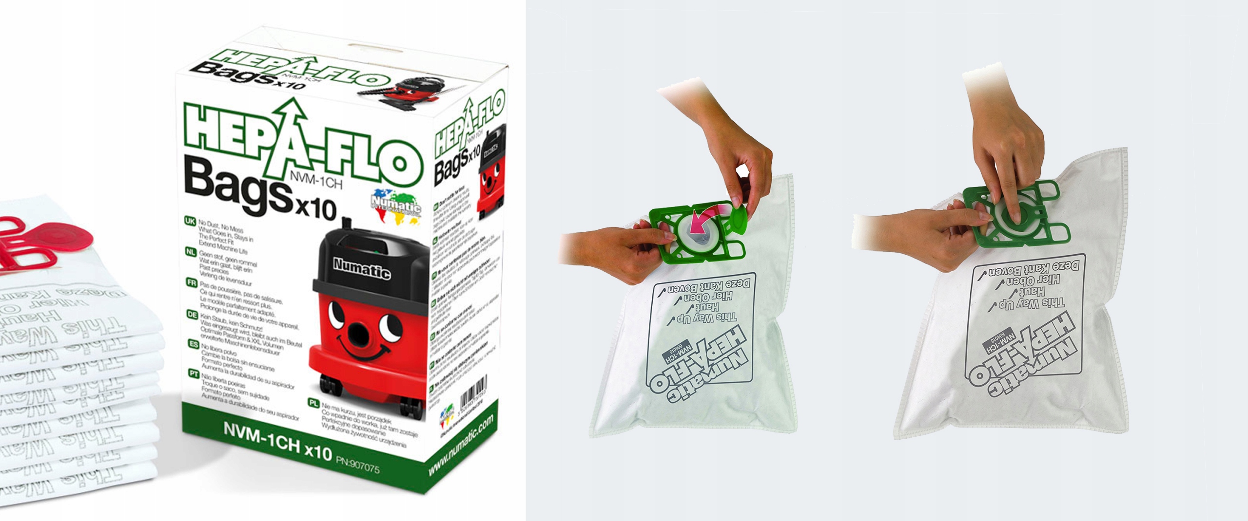 Оригинальные сумки HEPA-Flo®, запатентованные Numatic, изготовлены из многослойного нетканого материала фильтр с системой гигиенического закрытия. Конструкция мешка гарантирует, что пылесос не теряет силы всасывания по мере его заполнения (как это происходит с бумажным пакетом), он потребляет меньше электричество и оставляет воздух чище!