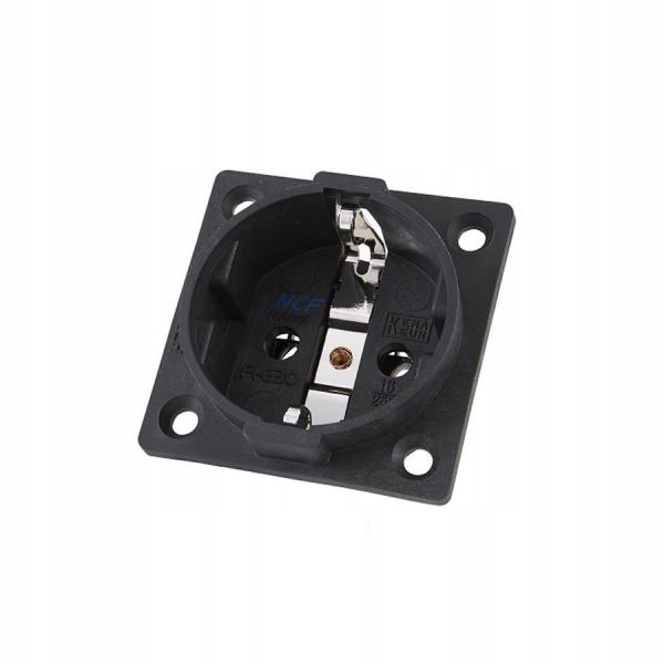 Gniazdo zasilające SCHUKO do zabudowy. Wszystkie metalowe części wykonano ze stopu miedzi pokrytego rodem. Korpus gniazda wykonano z użyciem technologii NCF. Maksymalne obciążenie 15A/250V AC.